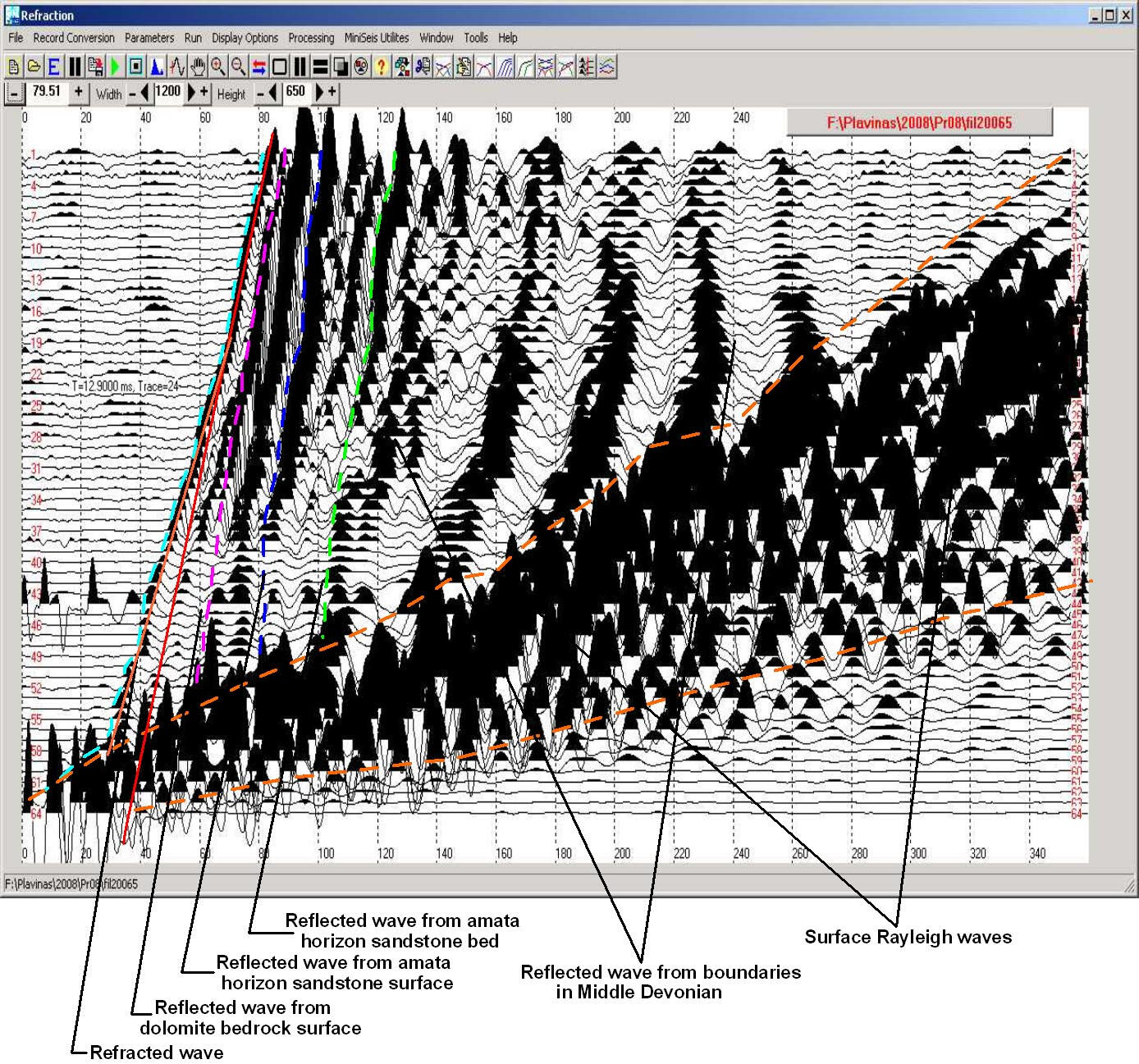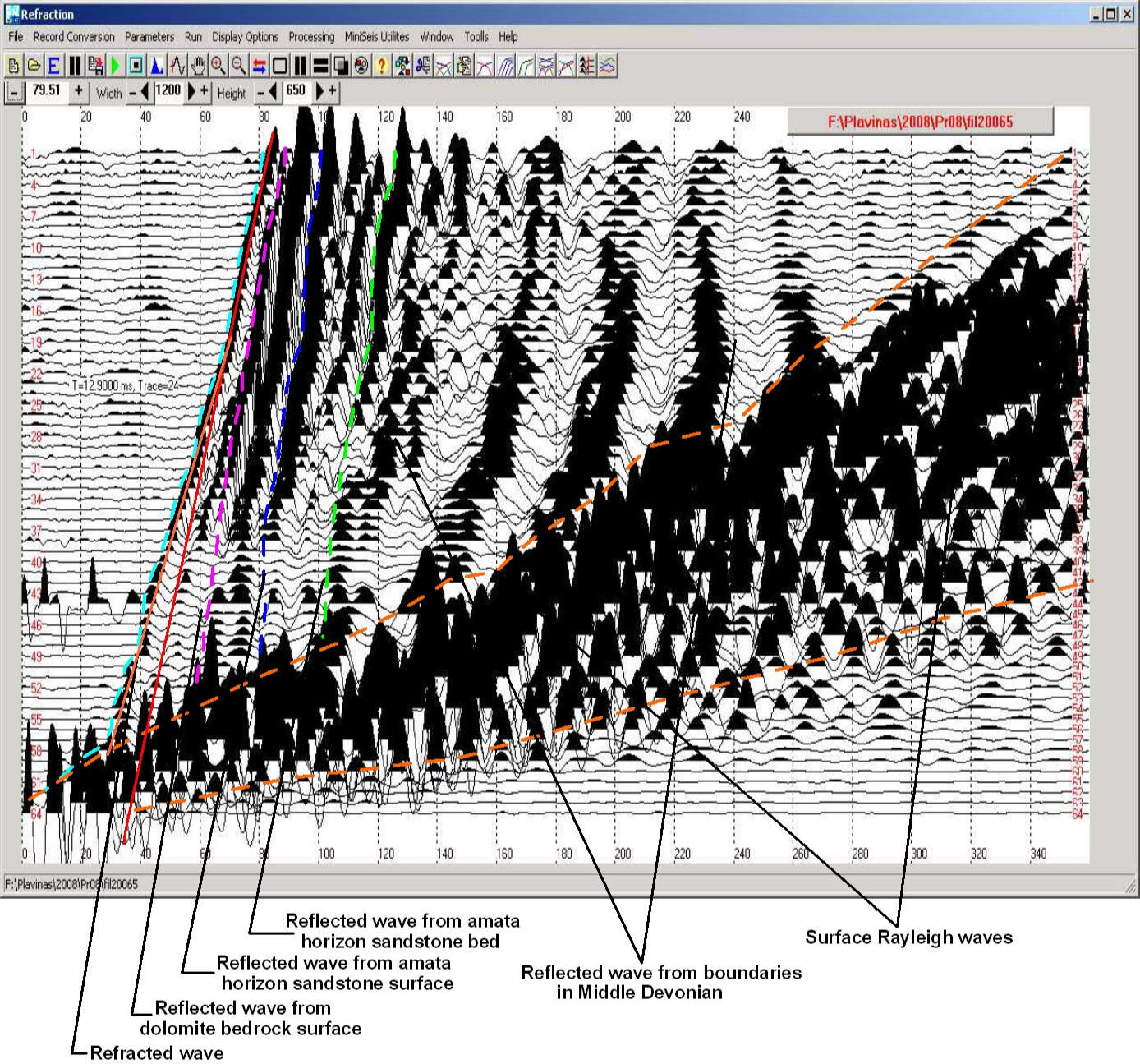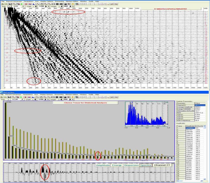 An example of refraction wave record processing for Vp velocity obtaining with SeisOptim software using at the one of Choclon II areas. Investigations of the bottom interior of the future flotation waste repository of metallurgical integrated plant (Peru).