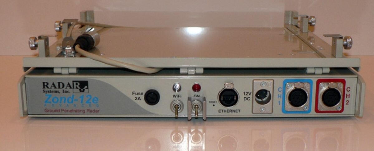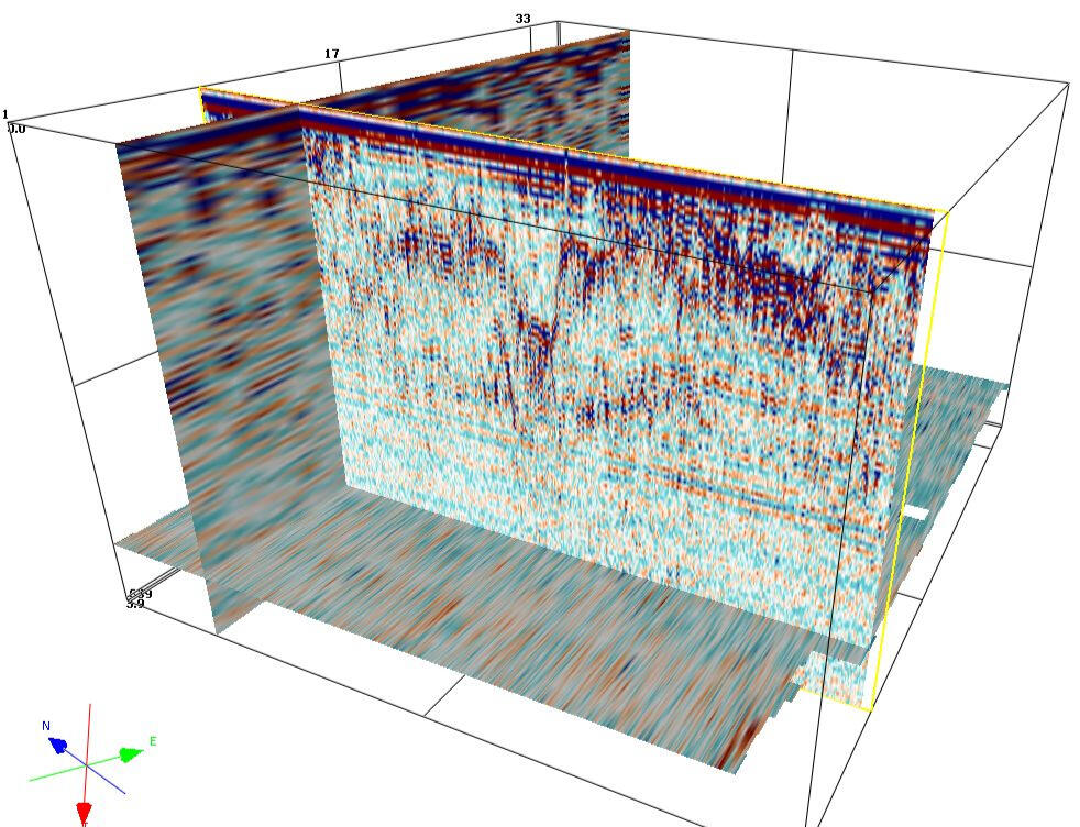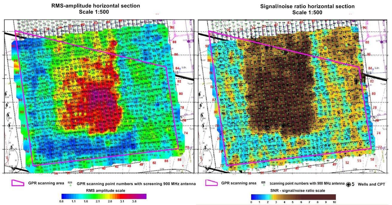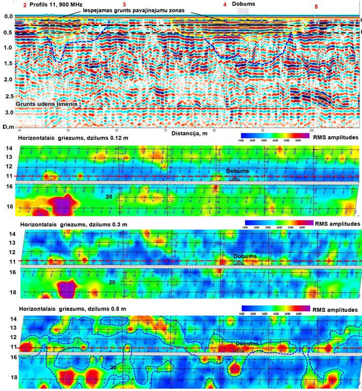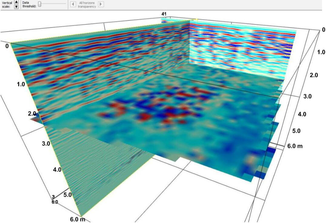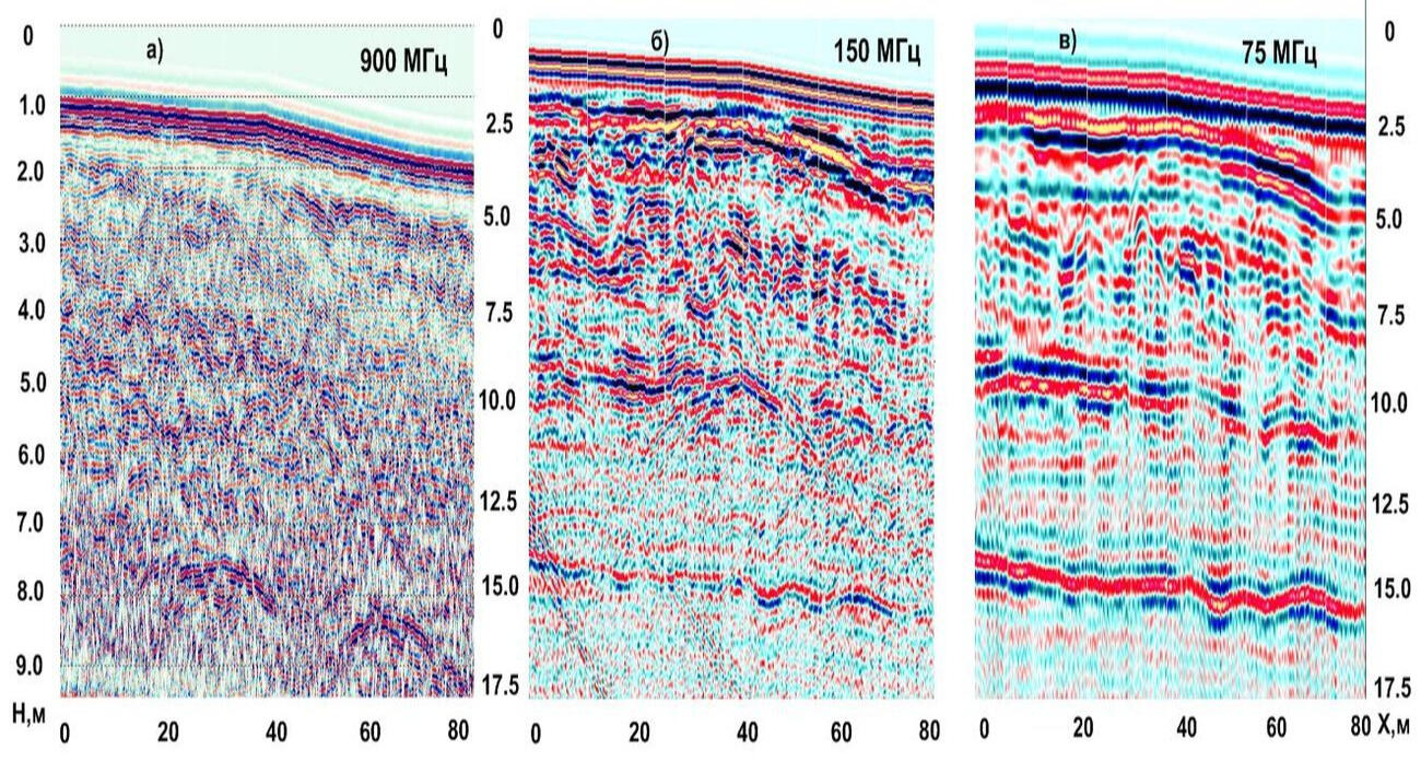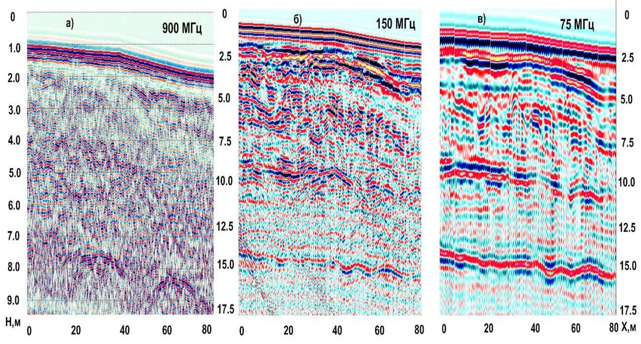 The most widely used method for localizing foreign objects in soil massifs is georadar sensing. It is the simplest in terms of field work technology and allows you to quickly survey fairly large areas. Data processing is also quite simple, but requires much more time. The simplicity of field technology makes it possible to work out a fairly dense network of profiles at the survey site, which makes it possible to subsequently move from two-dimensional sections along profiles to a three-dimensional display of the soil mass under study.A network of georadar profiles was developed at the site using receiver-emitting antennas of various types with probing pulse frequencies of 75 MHz, 150 MHz and 900 MHz. The figure below shows examples of displaying the remains of an old foundation at a depth of 1.9-2.3 m on GPR sections obtained at different frequencies of the probing pulse.
