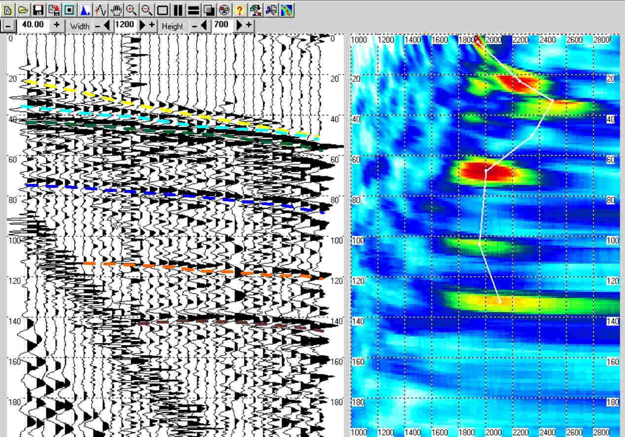 Seismogram of reflected waves and vertical velocity spectrum