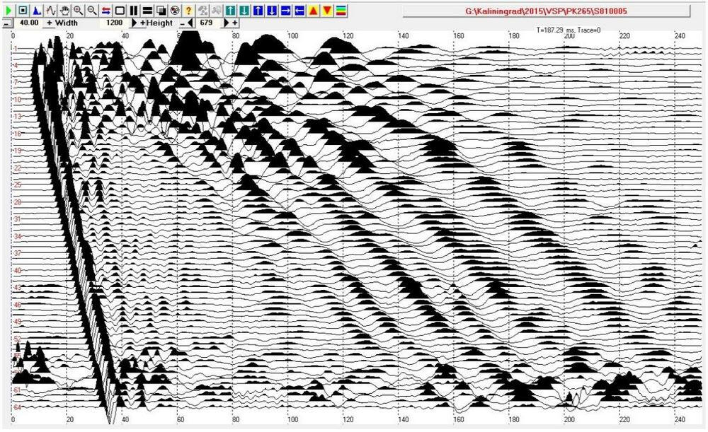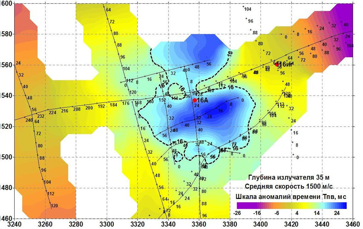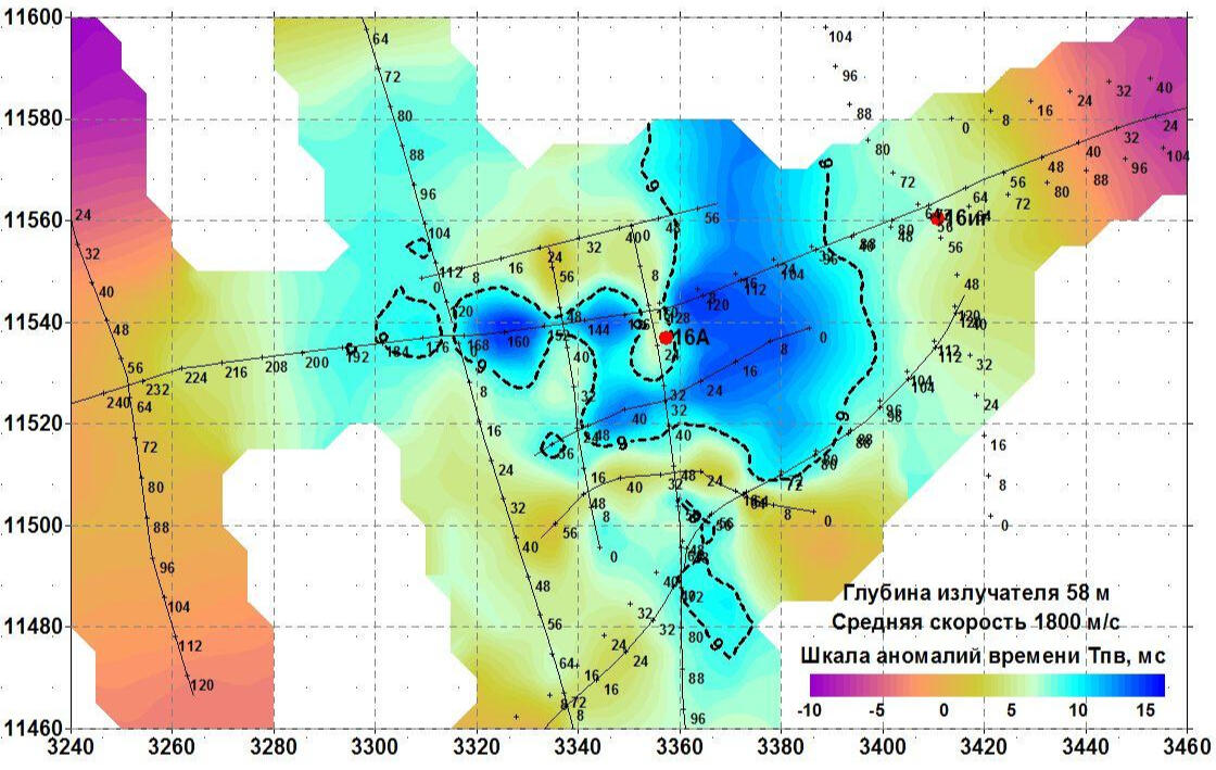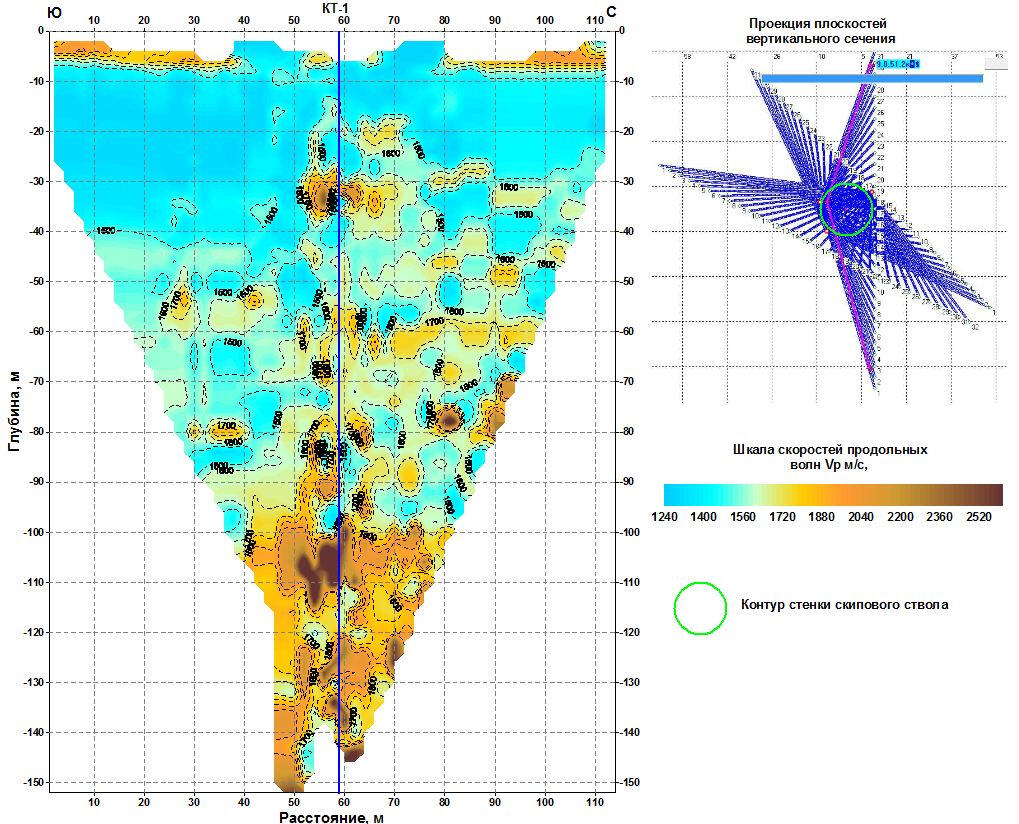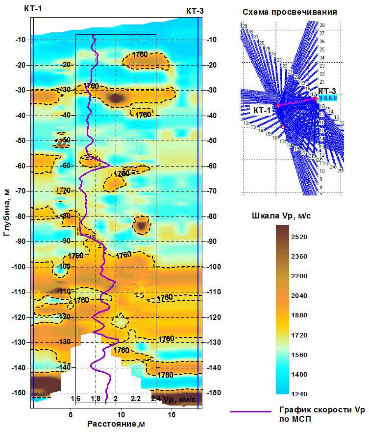 The non-longitudinal VSP data processing program provides calculation of various kinematic and dynamic parameters of the recorded waves. In particular, horizontal sections of the field of first arrival times are calculated for different levels of the source location in the well. Anomalies of this field are a direct and most obvious sign of the presence of local inhomogeneities in the propagation of longitudinal wave velocities in the soil massif.