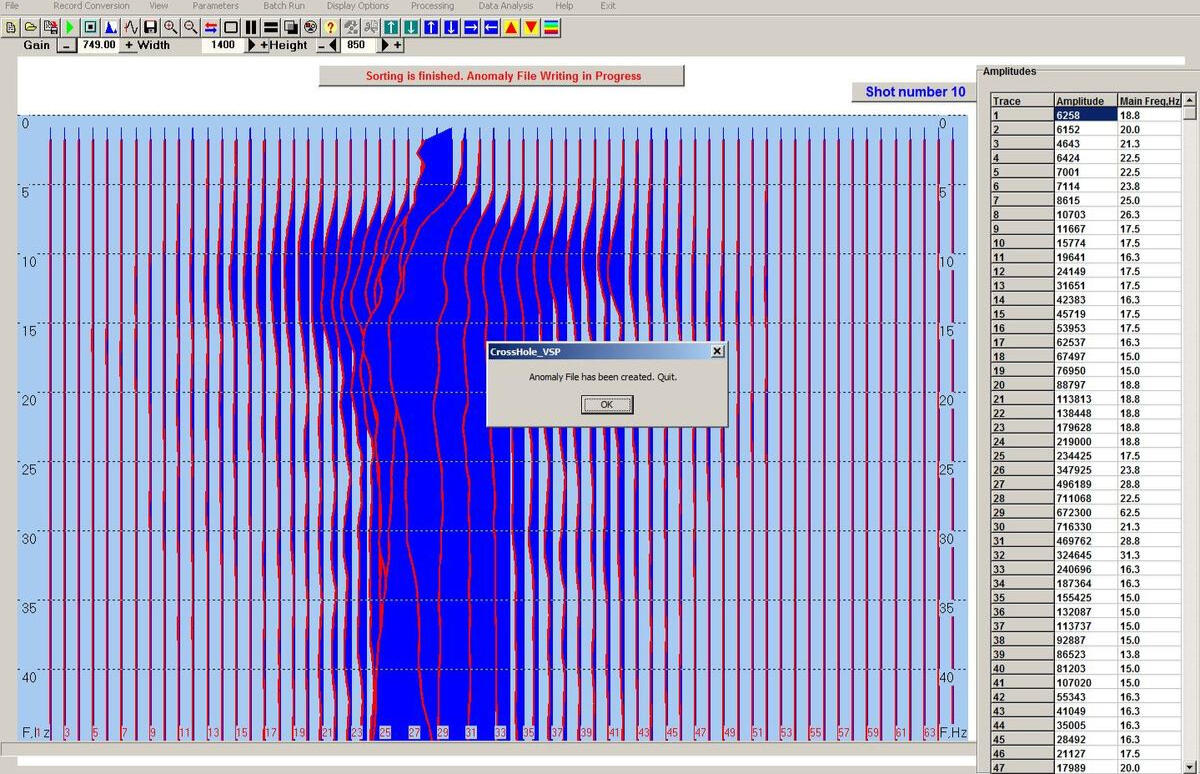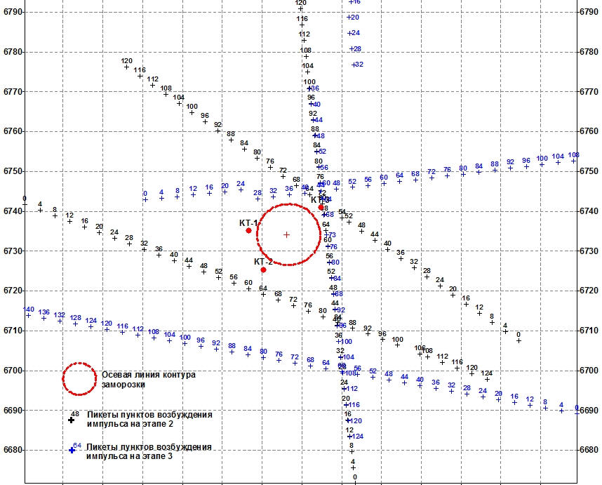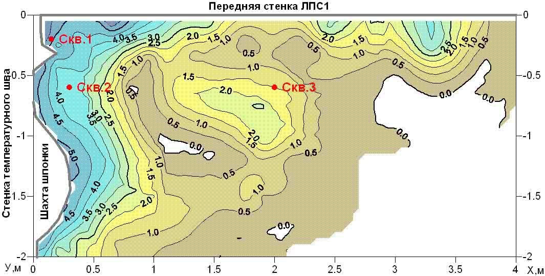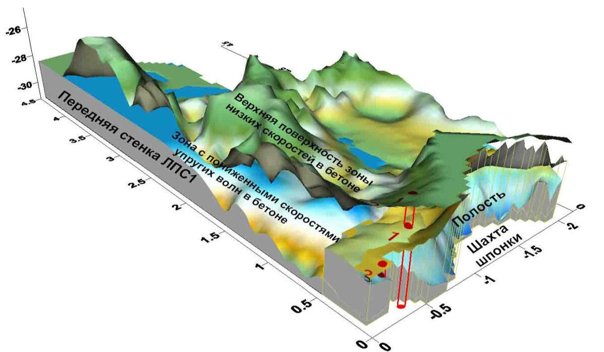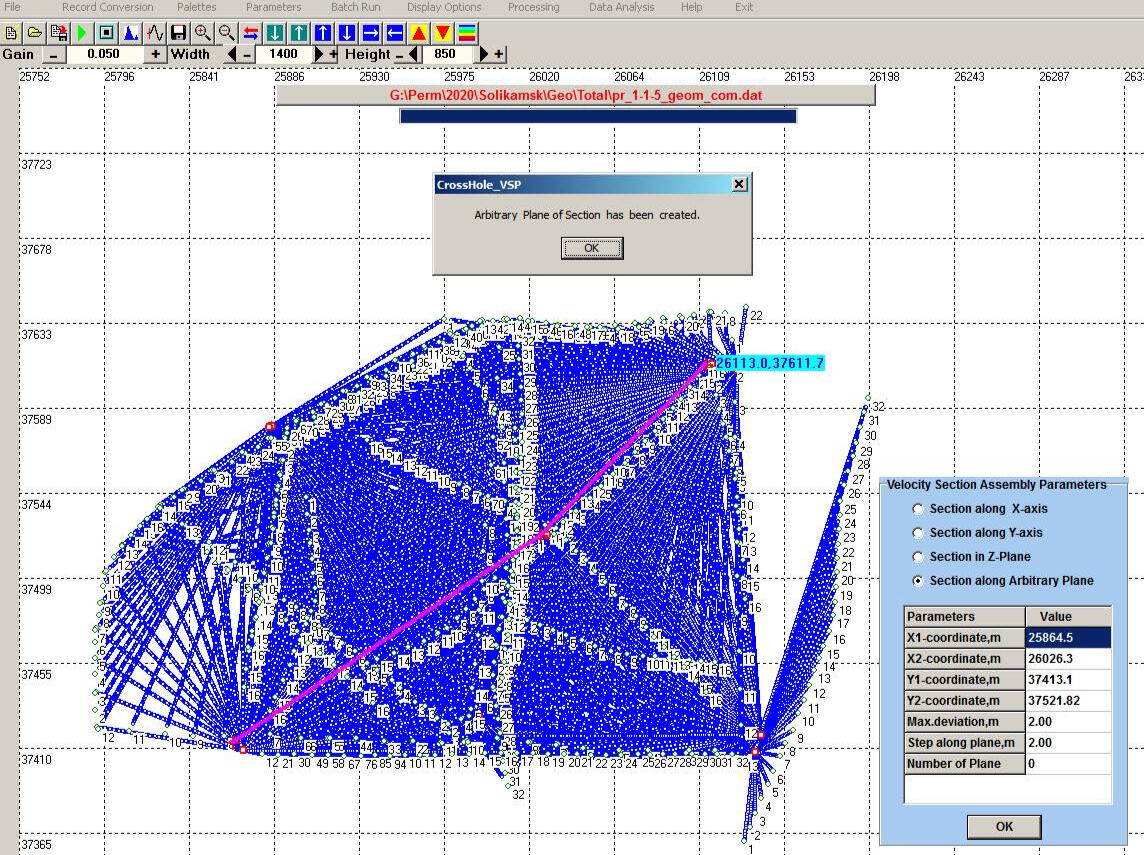 The non-longitudinal VSP data processing program provides calculation of various kinematic and dynamic parameters of the recorded waves. In particular, horizontal sections of the field of first arrival times are calculated for different levels of the source location in the well. Anomalies of this field are a direct and most obvious sign of the presence of local inhomogeneities in the propagation of longitudinal wave velocities in the soil massif.