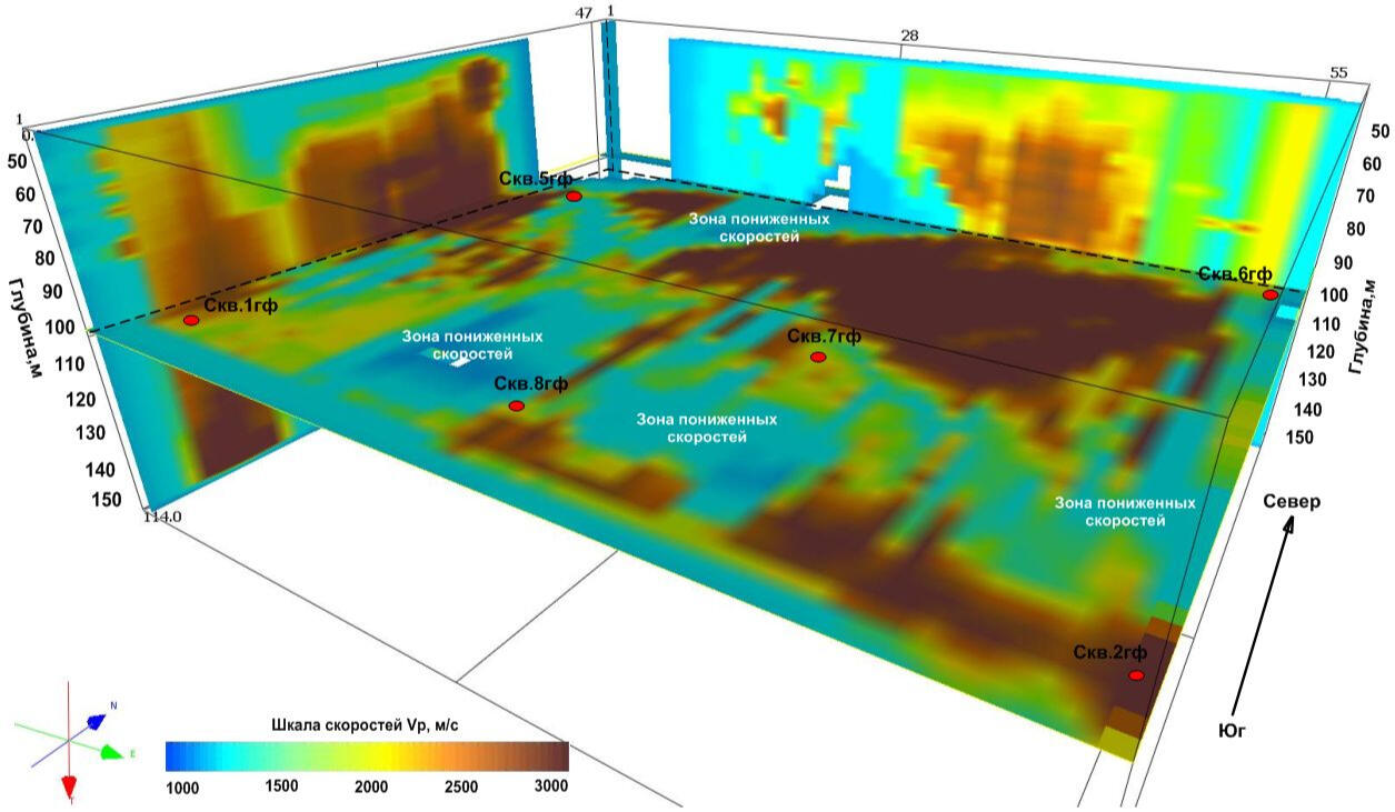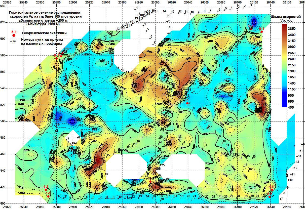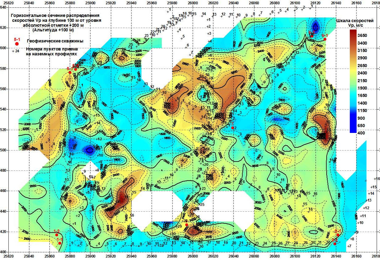 When processing the resulting data array from a set of observation profiles on the surface, a spatial 3-dimensional sample of coordinated velocity values associated with various segments of seismic rays is collected. For geological interpretation of data from this sample, horizontal and vertical velocity sections are calculated, reflecting local heterogeneities of the soil mass and bedrock.The compilation sample for all wells in the polygon is a spatial set of points with velocity values, similar to the velocity cube obtained by processing 3D land seismic data. Subsequent analysis of the velocity distribution in the array is performed using a series of randomly oriented vertical and horizontal sections of the resulting spatial sample. An example of such a horizontal section at an absolute elevation of +100 m (approximately at a depth of 100 m from the surface) is shown in the figure on the left.