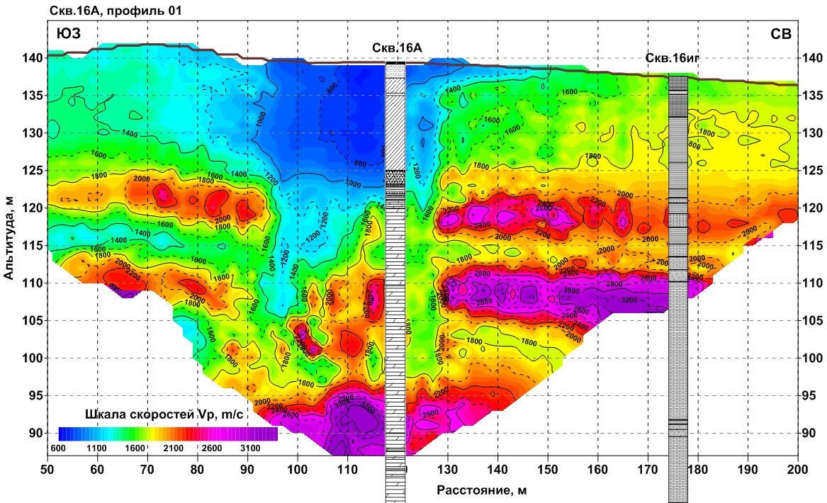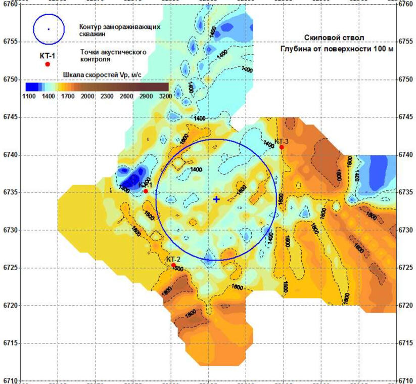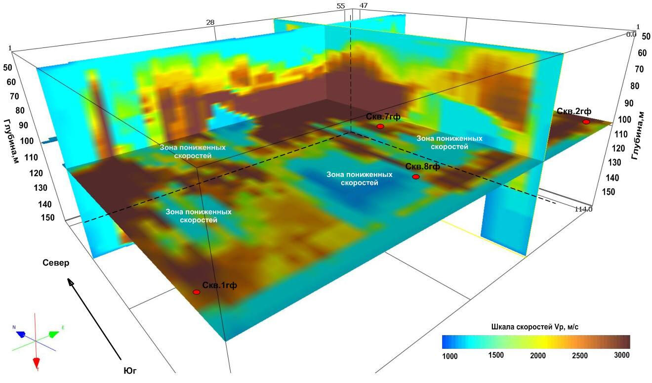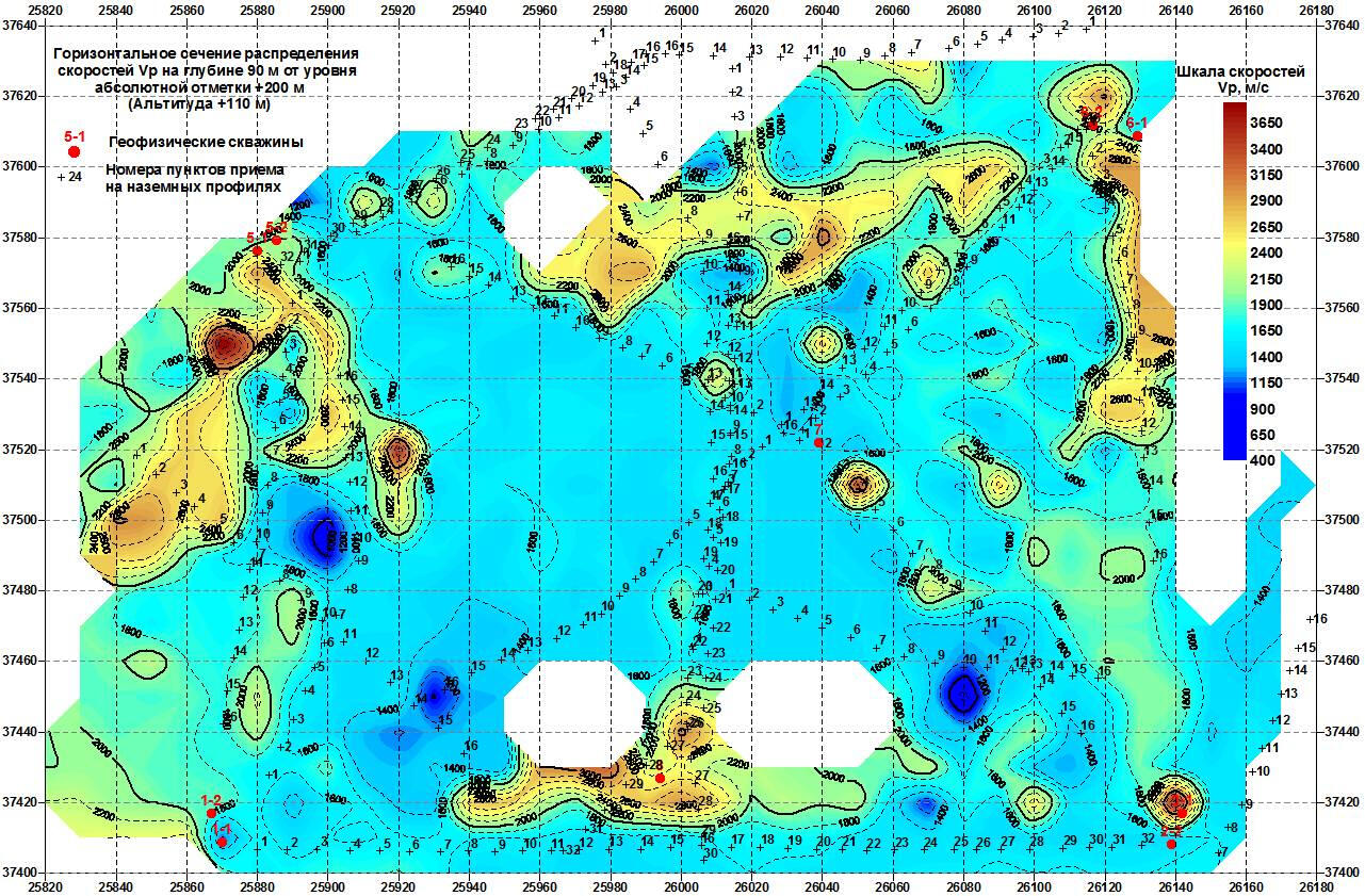 When processing the resulting data array from a set of observation profiles on the surface, a spatial 3-dimensional sample of coordinated velocity values associated with various segments of seismic rays is collected. For geological interpretation of data from this sample, horizontal and vertical velocity sections are calculated, reflecting local heterogeneities of the soil mass and bedrock.The compilation sample for all wells in the polygon is a spatial set of points with velocity values, similar to the velocity cube obtained by processing 3D land seismic data. Subsequent analysis of the velocity distribution in the array is performed using a series of randomly oriented vertical and horizontal sections of the resulting spatial sample. An example of such a horizontal section at an absolute elevation of +100 m (approximately at a depth of 100 m from the surface) is shown in the figure on the left.