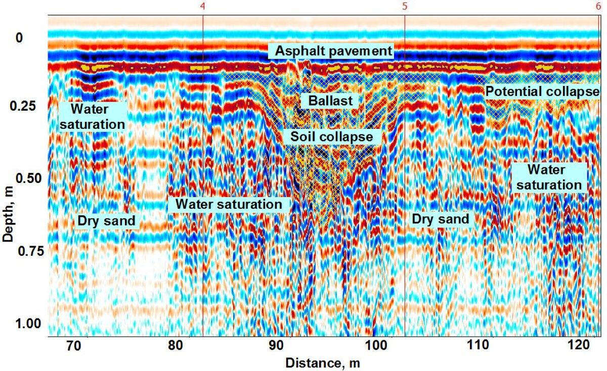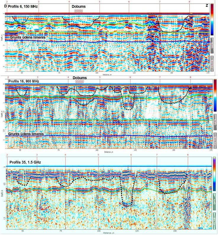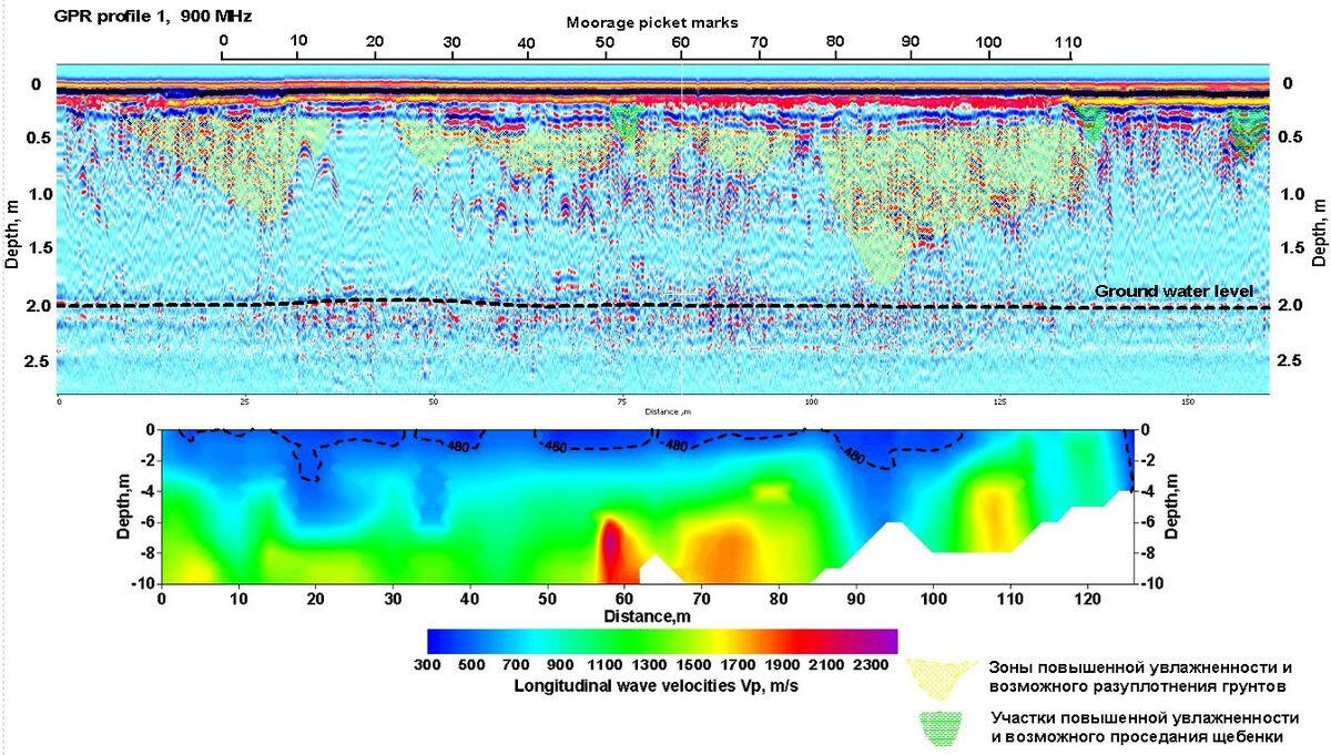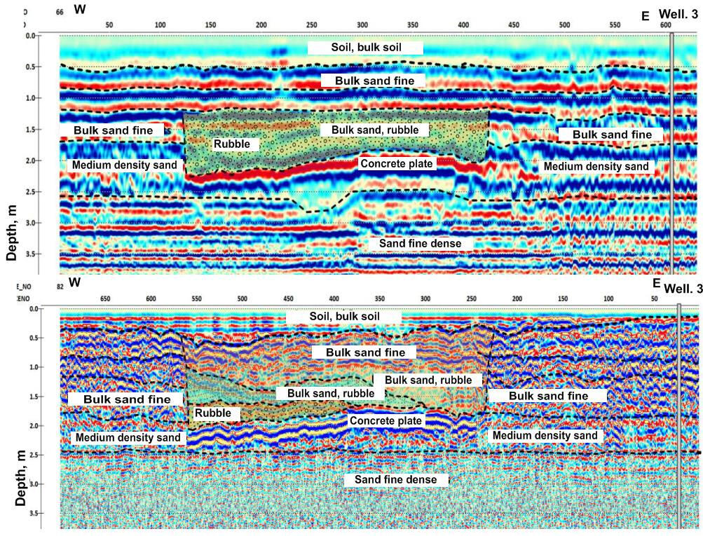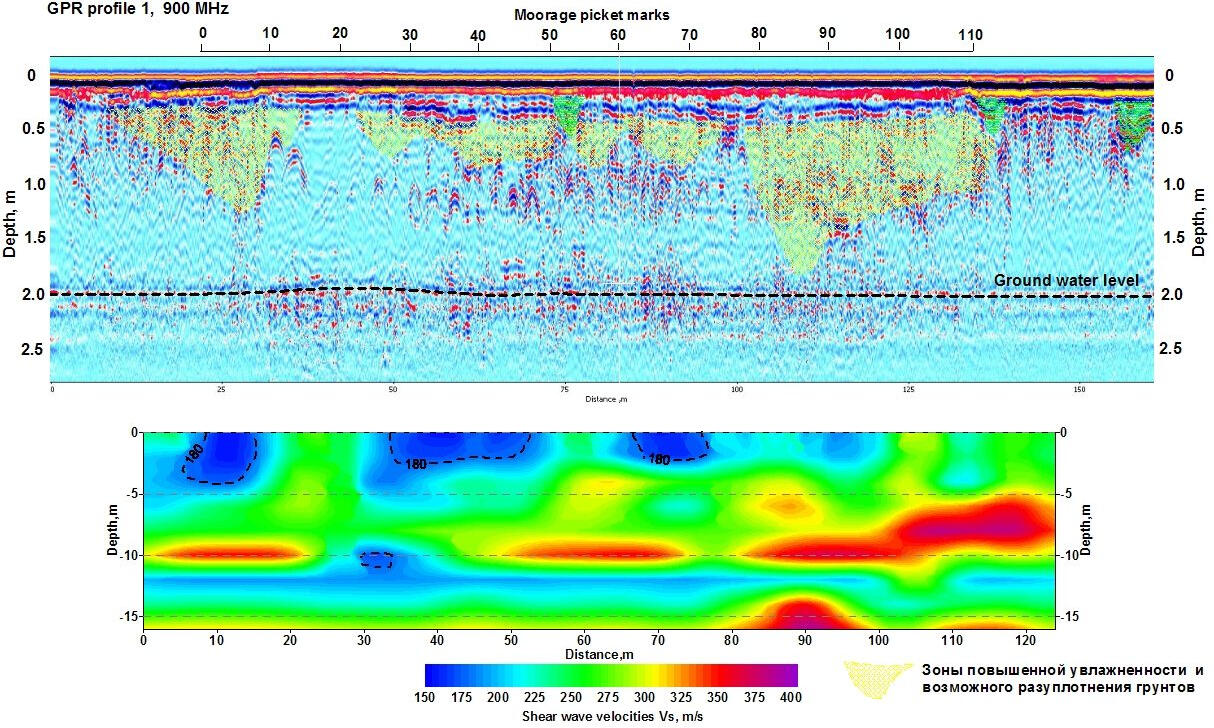 The use of shielded high-frequency antenna is more effective within urban areas during detection of soil decompaction zones under hard surfaces of roads and pavements. An example of interpretation of bulk soil array sounding data is shown below. Under the cobblestone coating and crushed stone backfilling, there are areas of increased amplitudes of reflections and prolonged time of their registration associated with possible zones of decompaction and increased water saturation in sandy soil.Example of GPR profile obtained using a shielded high frequency (900 MHz) antenna at the berth area with cobblestone pavement.The strongest reflecting boundaries are most likely associated with the surfaces of water-saturated lenses in a sandy massif. Due to accumulation of rainwater on the paving stones, it was possible their penetrate into the near-surface layer of crushed stone and soil, which significantly changes and complicates wave pattern on the records due to a sharp change in the dielectric permeability of the soil. Low-frequency radar sensing is a very effective method for mapping the surface of ground waters in sandy sediments. At the same time, the surface of water-saturated soils is a strong shielding boundary, below which the tracing of reflecting boundaries in the sandy-clay thickness is problematic.
