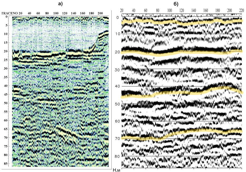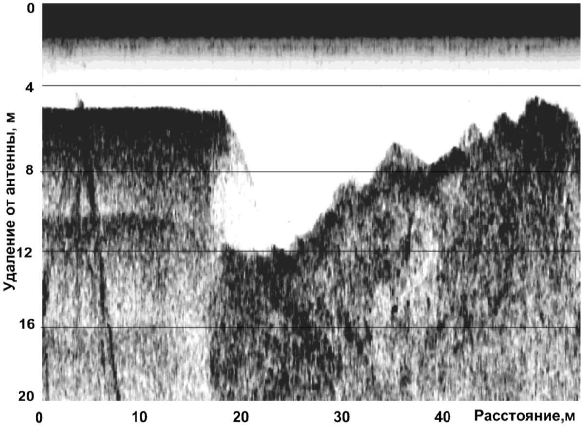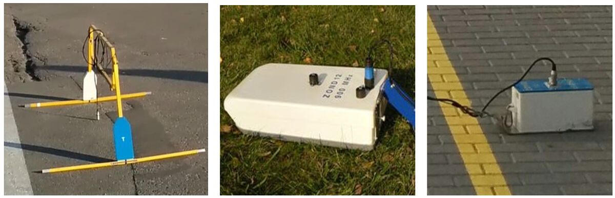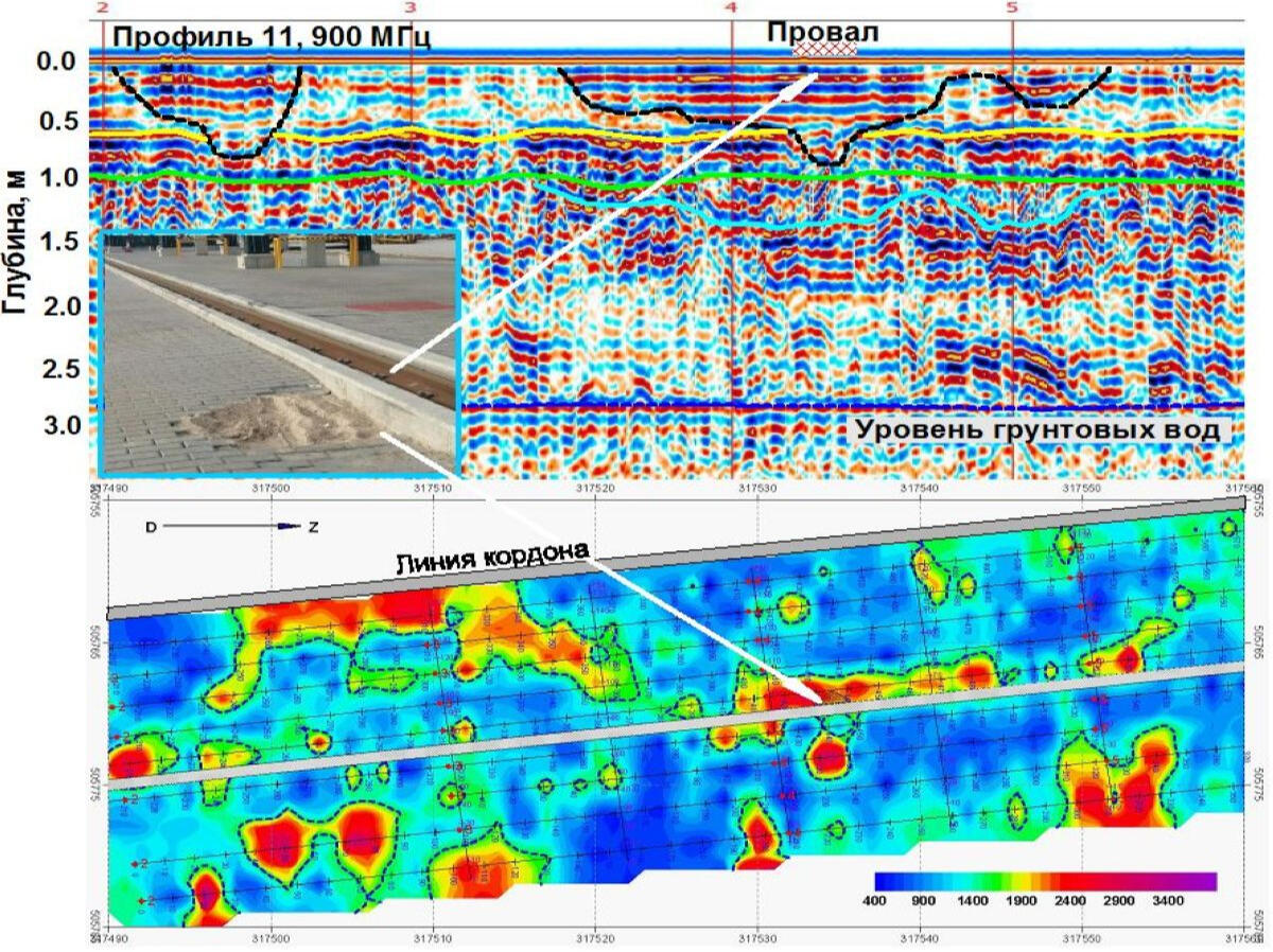 The use of shielded high-frequency antenna is more effective within urban areas during detection of soil decompaction zones under hard surfaces of roads and pavements. An example of interpretation of bulk soil array sounding data is shown below. Under the cobblestone coating and crushed stone backfilling, there are areas of increased amplitudes of reflections and prolonged time of their registration associated with possible zones of decompaction and increased water saturation in sandy soil.Example of GPR profile obtained using a shielded high frequency (900 MHz) antenna at the berth area with cobblestone pavement.The strongest reflecting boundaries are most likely associated with the surfaces of water-saturated lenses in a sandy massif. Due to accumulation of rainwater on the paving stones, it was possible their penetrate into the near-surface layer of crushed stone and soil, which significantly changes and complicates wave pattern on the records due to a sharp change in the dielectric permeability of the soil. Low-frequency radar sensing is a very effective method for mapping the surface of ground waters in sandy sediments. At the same time, the surface of water-saturated soils is a strong shielding boundary, below which the tracing of reflecting boundaries in the sandy-clay thickness is problematic.