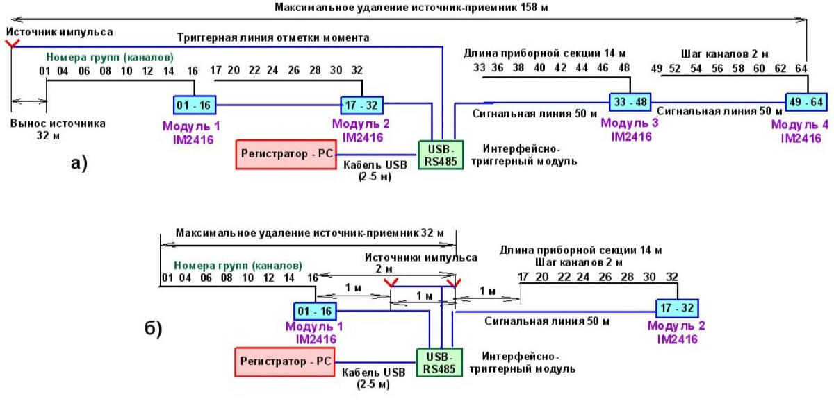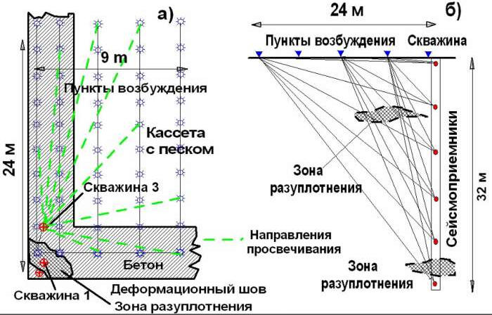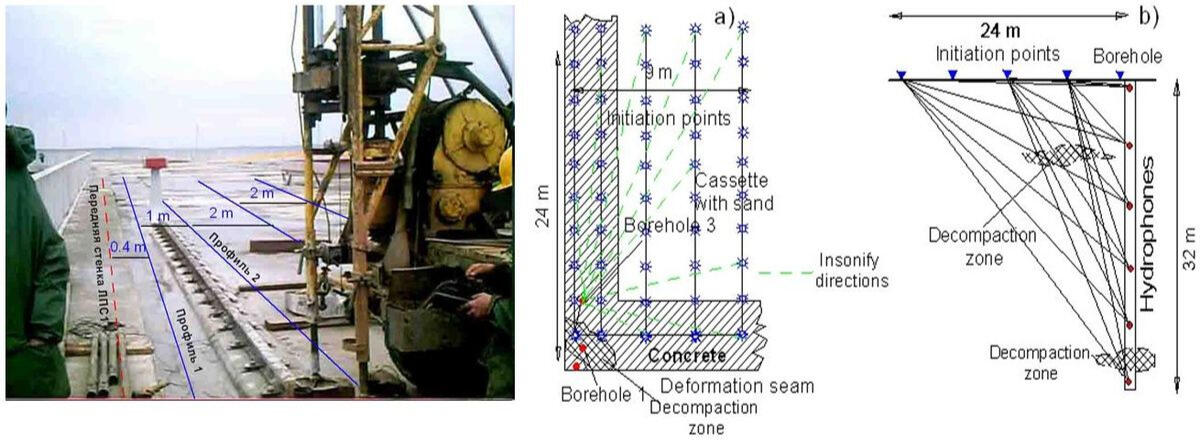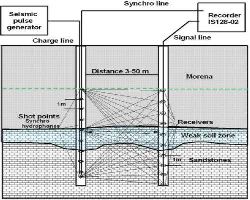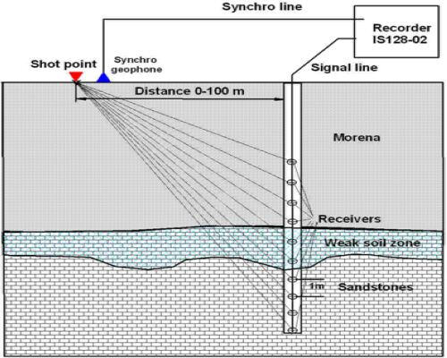 The receiving of oscillations is performed by a multichannel (8 to 24 channels) piezo-hydrophone probe into the observation well. The requirements for the arrangement of observation wells in this case remain the same as for measurements according to ASTM D,-4428/D standards.If it is impossible to use polyethylene pipes for casing and in case of partial replacement with steel ones in the upper collapsing intervals of the ground array, the observations are carried out in the intervals of open well trunk to the level of filling them with water. A more powerful electric spark type emitter (sparker) with discharge energy of the order of 1-1.5 kJ moves with a given step along the trunk of the neighboring well, as a rule, for the entire length of the studied interval. If necessary to study the geological section interval, exceeding the length of the receiving probe, the probe is moved along the trunk of the observation well to a new position, and a series of pulse excitations with the movement of the source along the well is repeated.