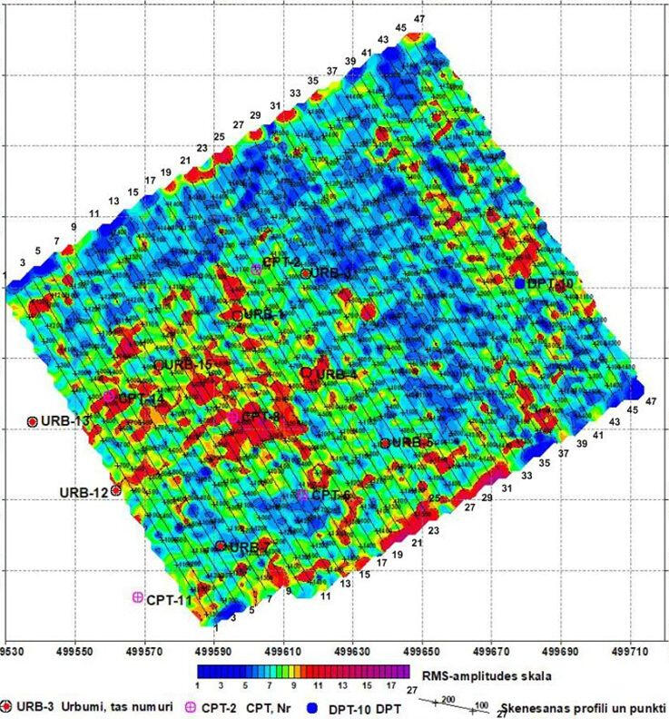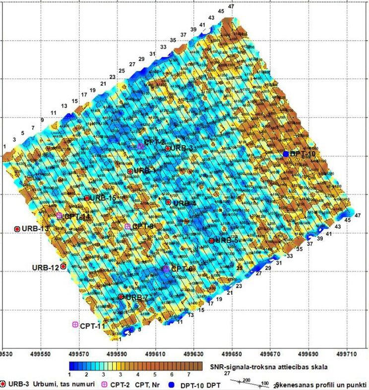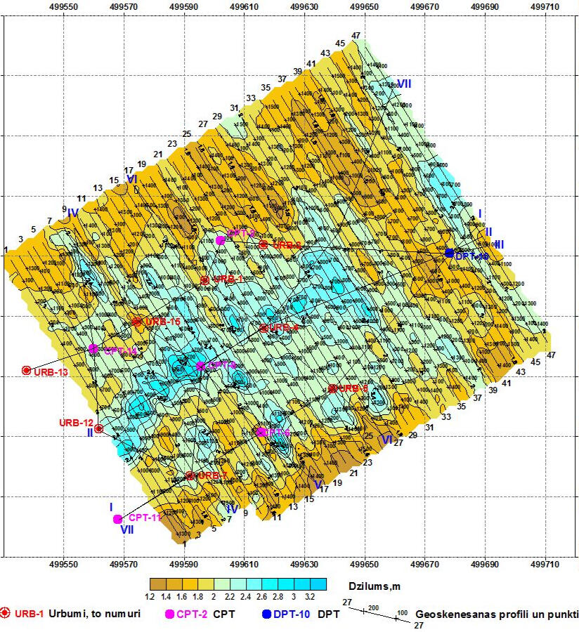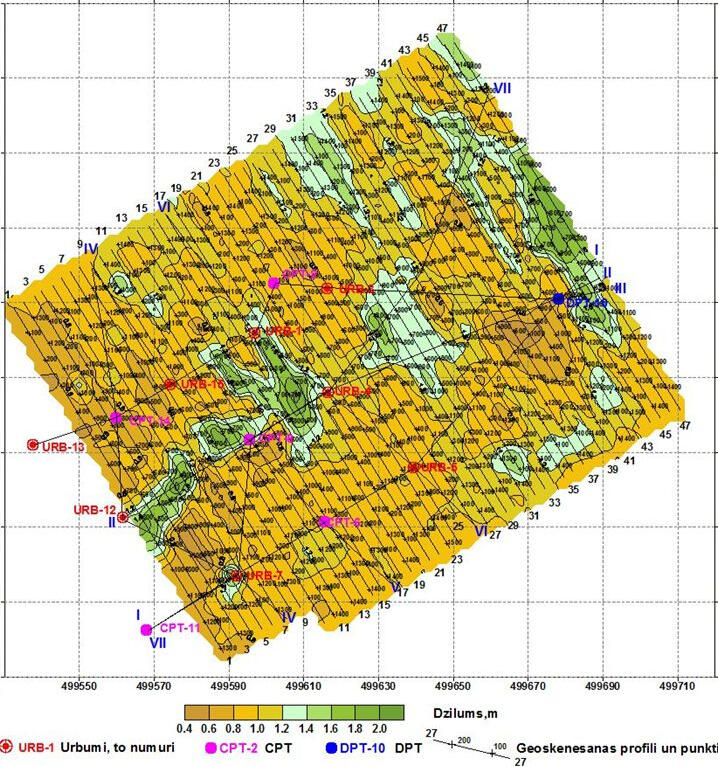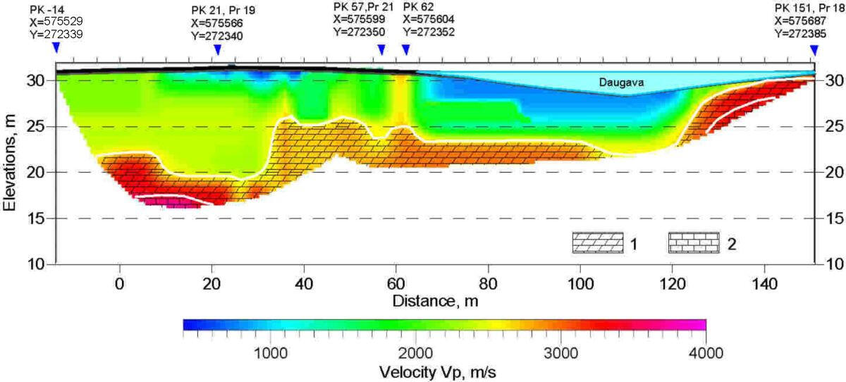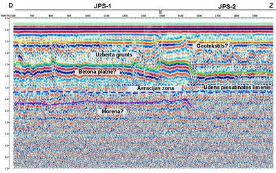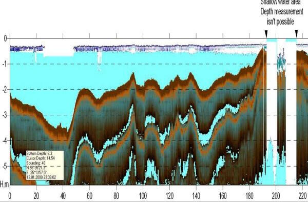 CDP cross-section in depth scale on the area with shallow dolomite bedrock. Lower pool of Plavinas HPP dam, Latvia