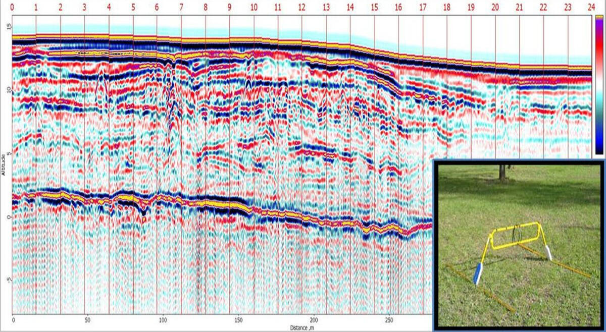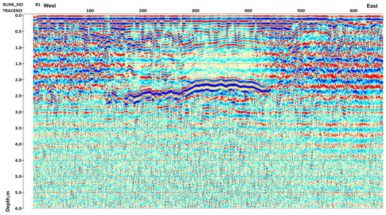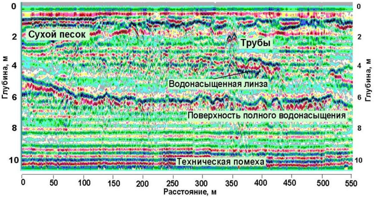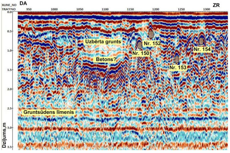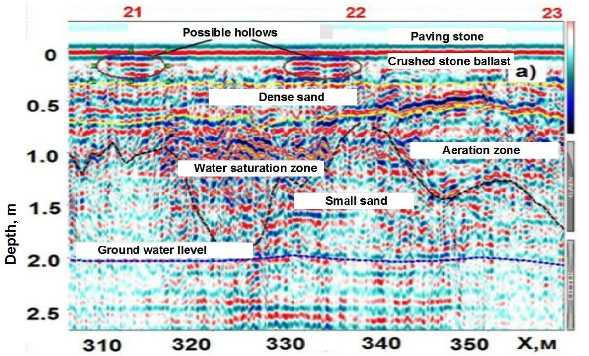Under the main reflection phase there are areas of increased amplitude of the signal reflected (scattered) on many small objects. Such objects on the GPR profile are most likely interpreted as fragments of concrete or asphalt pavement. Many hyperbolic phase axes of diffraction waves are recorded on a profile fragment at a depth of 0.2 m to 1.0 m. Pronounced diffractions indicate the presence of dense foreign bodies in the soil, possibly fragments of concrete structures of an old building.The profile shows characteristic diffraction waves from smaller objects, such as pipes, communication channels, wells, etc. The figure shows examples of the manifestation of such objects in the form of hyperbolic wave packets.The strongest reflective boundaries are probably associated with the surfaces of water-saturated lenses in the sand mass. Low-frequency radar sounding is a very effective method for mapping groundwater surfaces in sandy sediments. At the same time, the surface of water-saturated soils represents a rigid screening boundary, below which it is problematic to trace reflective boundaries in the sandy-clayey massif.