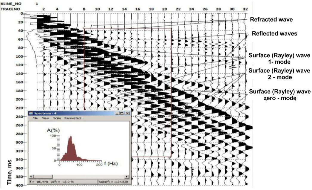 In engineering seismic exploration, using the simplest surface sources of elastic waves, more than 85 percent of the impact energy is spent on the formation of low-frequency and low-velocity surface waves. The following seismogram, obtained on the asphalt pavement of the embankment with an 8 kg sledge hammer pulse, illustrates the dominance of low-velocity surface waves in relation to refracted and reflected waves. Being the strongest hindrances for the method of reflected waves, Rayleigh surface waves at the same time contain very valuable information for the study of soil properties about the velocity of propagation of transverse waves.The most advanced and rapidly developing at present in shallow seismics methods of processing based on multi-channel analysis of surface waves (MASW), gives quite a detailed one and two - dimensional model of shear wave velocities Vs distribution in the soil mass. A natural limitation of the MASW technique is a small depth of penetration of the surface wave energy into the soil massif thickness. An essential factor for increasing the depth of the method is the possibility of attracting passive low-frequency noise of transport and operating mechanisms for joint analysis with the records obtained in the active mode.
