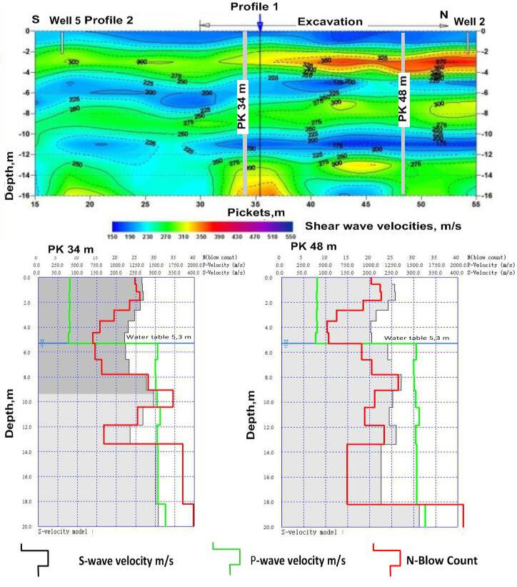 Examples of determining of transverse waves propagation velocity according to MASW and prediction of physical and mechanical properties of soils using the method of refracted waves along one of the lines of the working of the gold-bearing field in the South of Peru are shown in the following figure.Based on the longitudinal waves propagation velocity sections obtained from first arrivals of refracted waves and transverse wave velocities from MASW method the sections of the forecast density, Poisson's ratio and elastic modulus are calculated along one of profile at the site of placer gold deposits working (Chucapaca, department Moquegua, Peru).