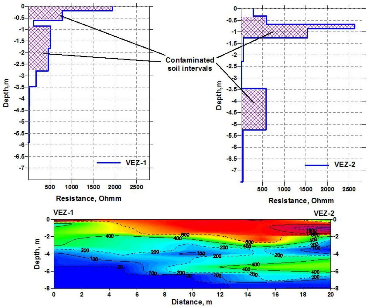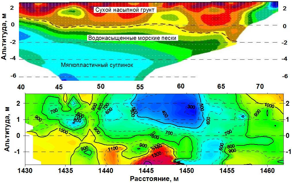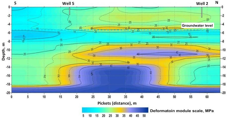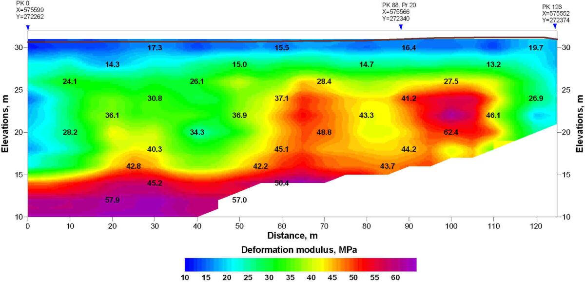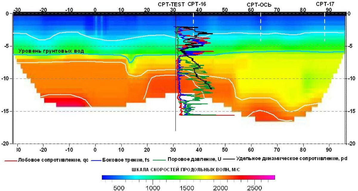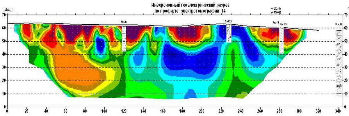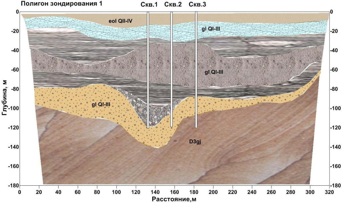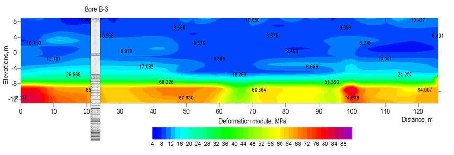 A geoelectric section along the bottom of a deep glacial valley filled with moraine loams and large-block fluvial deposits along the profile.In the section, by the areas of reduced resistances display the places of the water-saturated moraine loam exit to the earth’s surface. High resistances are characterized the areas with a high content of coarse - grained material - pebbles, rubble, boulders, which is confirmed by the data of cone penetration (CPT) and standard penetration (SPT) tests and drilling. In the initial part of the profile at a depth of more than 20 m, in all probability, the accumulation of large blocks of fluvioglacial material in the edge part of the buried valley is displayed.