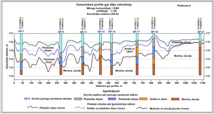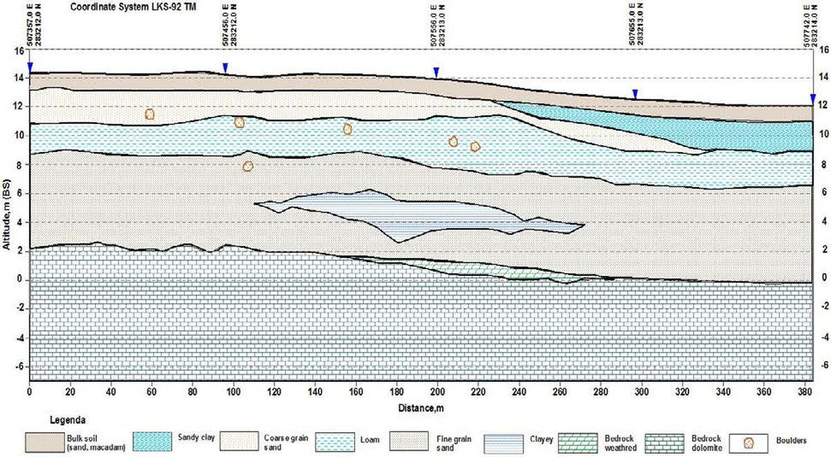The upper part of the section is alluvial deposits. In the initial part of the profile, on the valley edge – Salaspils carbonates . Thickness of the dolomites is small, practically whole incision locates into the Upper Devonian Amata sandstone sediments. The sides of the lower part of the incision are composed of weak sandstones of the Amata sediments. The velocity of longitudinal waves propagation in them differs little from the moraine loam filling the valley, so the sides of the incision can be distinguished only conditionally, by changing the nature of the stratification.
