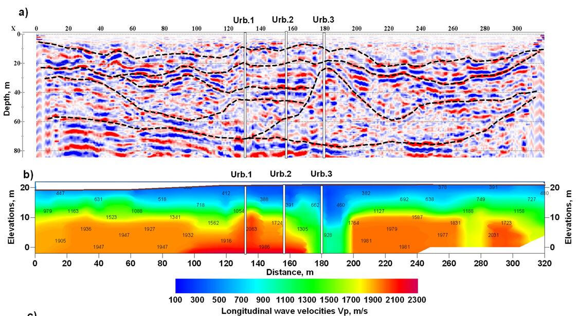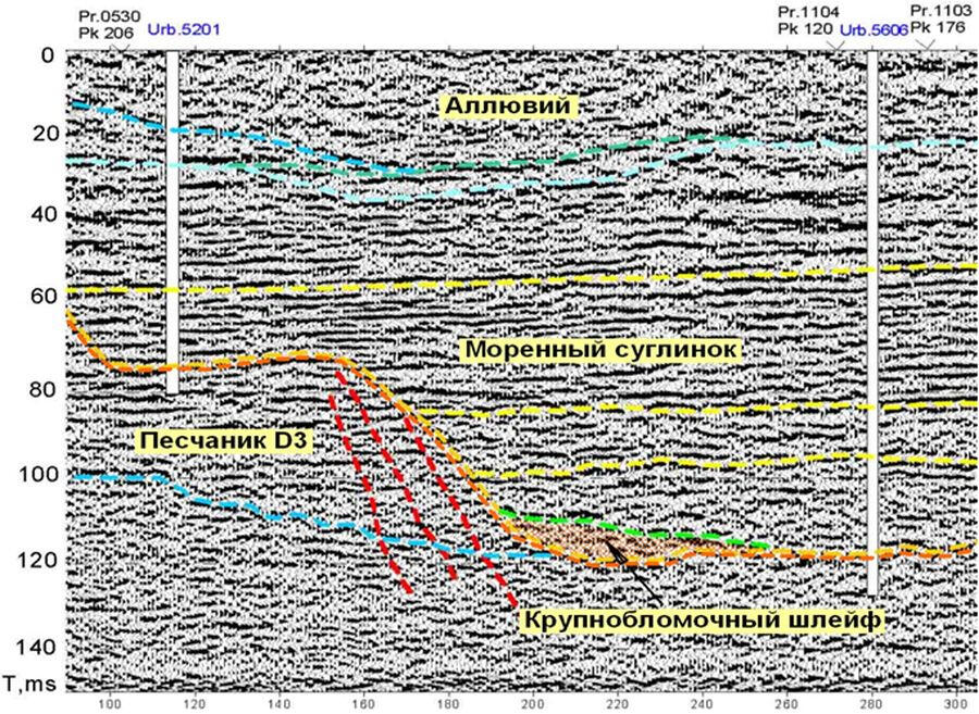 The section shows the complex structure of moraine deposits, filling the buried glacial valley, the formation of which occurred when glacier plowing, evidently during for several glaciers.Excitation of elastic waves by sledge hammer blows with accumulation of 3 impacts with the step of excitation points 4 m along the profile. Reflecting boundaries are traced to a depth of 200-220 m, which is displayed by the presence of energy sprouts on vertical velocity spectra.The use of a compact source – hammer is most appropriate in hard-to-reach areas. The weight of the hammer, depending on the planned detail of the study of the cut, may vary at different sites in a wide range – from 1 to 10 kg. However, due to the relatively high frequency of excited oscillations, they quickly fade in the upper loose layers of the soil, so the depth of energy penetration into the array and, especially, its distribution along the profile line on the surface are limited.