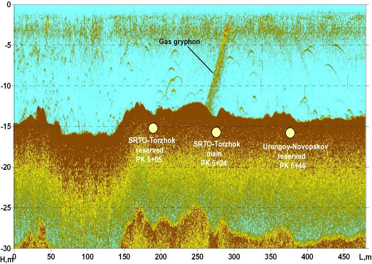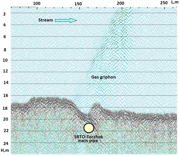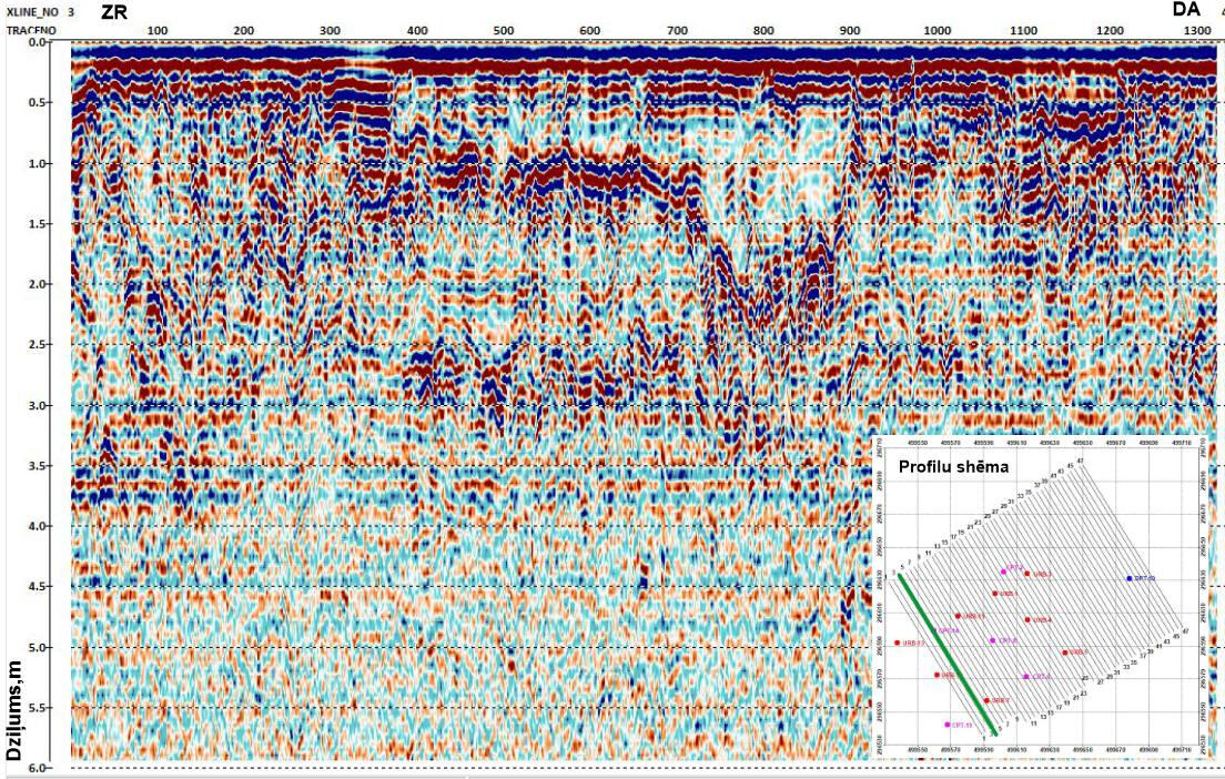 Mini-CDP section, inverted into depth scale, along the profile through the secondary sleeve-duct of buried palaeovalley. The area of Plavinas HPP upstream
