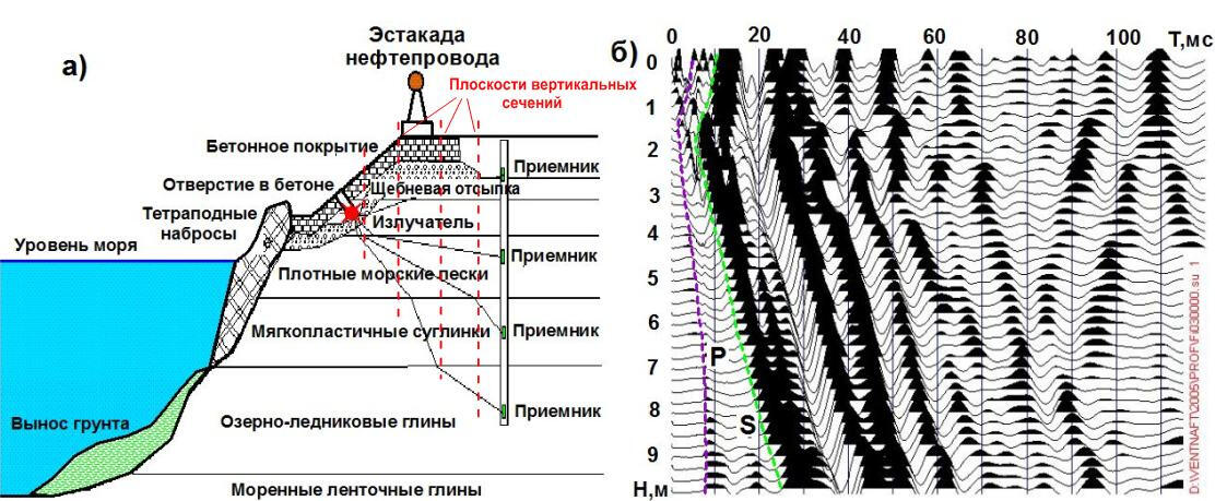 Vertical seismoacoustic profiling (VSP) in shallow geotechnical wells is used to solve various problems - to obtain static corrections for the zone of low velocities during conventional seismic exploration for oil and gas, to bind reflections on sections of shallowl-depth seismic CDP exploration, to obtain detailed sections of elastic modules and forecast estimates of strength and deformation properties of soils.