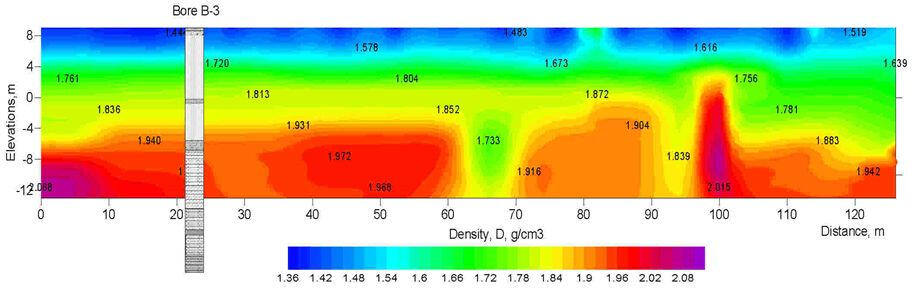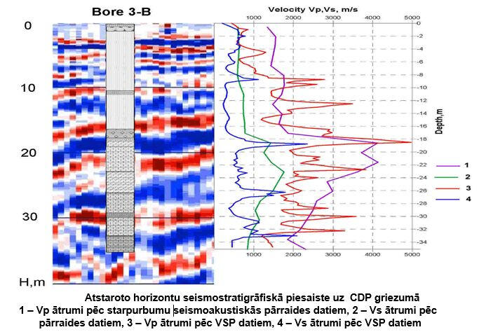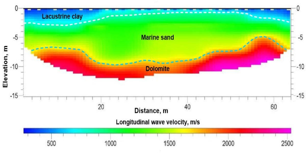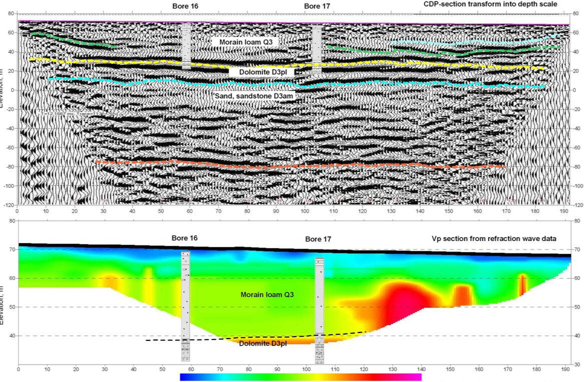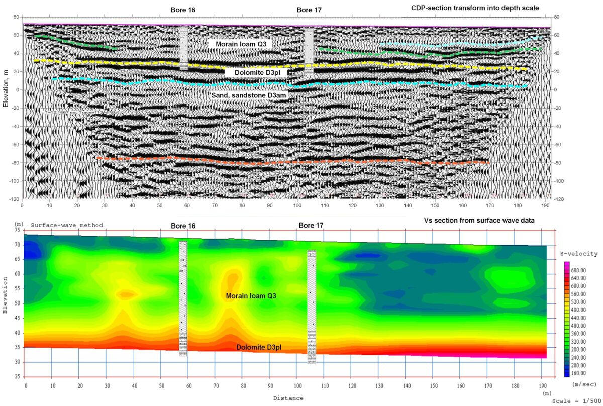 The sections shown in the figure characterize the typical ratio of representativeness of geotechnical methods, drilling and geophysics in assessing the physical properties of the soil massiif. Despite the relatively high density of drilling points and dynamic penetration testing, they do not provide detailed spatial configuration presentation of the boundaries of engineering-geological elements within a relatively homogeneous array of moraine loams. At the same time, the transverse wave velocities, which characterize, first of all, the properties of the soil skeleton, give a clear spatial picture of the distribution in the moraine loams of large-block fraction clusters (moraine ridges) with increased velocity of the transverse wave propagation.In geotechnical surveys, several types of waves are usually used to assess the state and properties of the soil massif and its saturated fluids: longitudinal reflected, refracted and surface waves. The following figure shows the types of seismic sections in one of the profiles in the central part of Latvia. In the upper part of the section up to 35 m of moraine loams lies, then about 20 m of Plavinian dolomites, below- the upper devonian sediments - Amata-Gauja sandstones lie. At a depth of 160 m (both sections in the depth scale) on the CDP section a fairly well-correlated boundary follows, perhaps the bed of the Amata-Gauja sandstones.These materials obtained with the use of 8 kg sledge hammers and a single 64-channel receiving arrangement of geophones with a step of 2 m. However, the complexity of the field work and data processing for these sections varies considerably. So, if during obtaining of CDP cross-section by the reflected waves, the interval between shot points was 2 m, to obtain velocity sections from refracted and surface waves were used only seismograms that were obtained with a step of shot points along the profile 16 m.