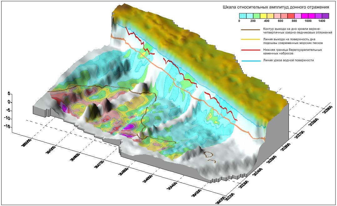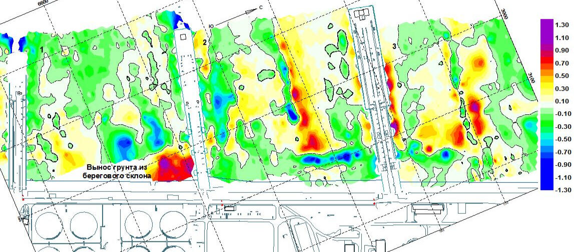 In the study area, on most GPR sections, the surface of a complex reflecting horizons located at a depth of 0.5 to 3.4 m are quite clearly visible. In the area on this reflective surface, several depressions with a depth of 1.0 to 3.4 m from the surface can be traced. The deepest of them looks like a narrow ravine 12-20 m wide and stretches from the southwestern edge of the research area to its center in a northeastern direction. At of the center of the study area there is a wider but less deep (up to 2.8 m) continuation.The picture shows a structural map of the surface of the depression bottoms. The depth of these depressions sometimes reaches 3.4 m. A wide depression of this reflecting boundary can be observed in the form of a depression elongated to the northwest with a complex boundary configuration in plan view near the northeastern border of the site. Judging by the large number of local heterogeneities in the layer above this boundary, it is dividing a layer of technogenic and soft fluvio-glacigenic sands from the surface of the dense sand and clayey deposits.