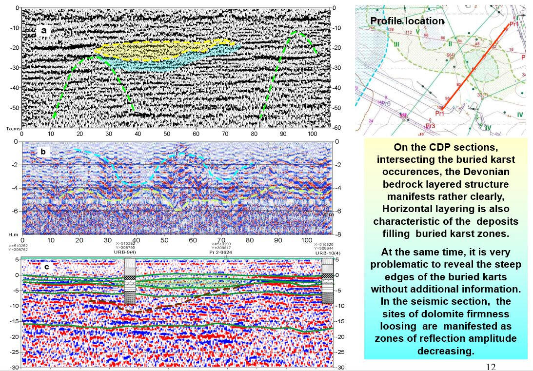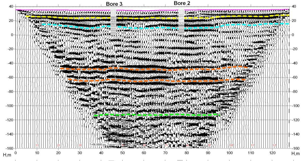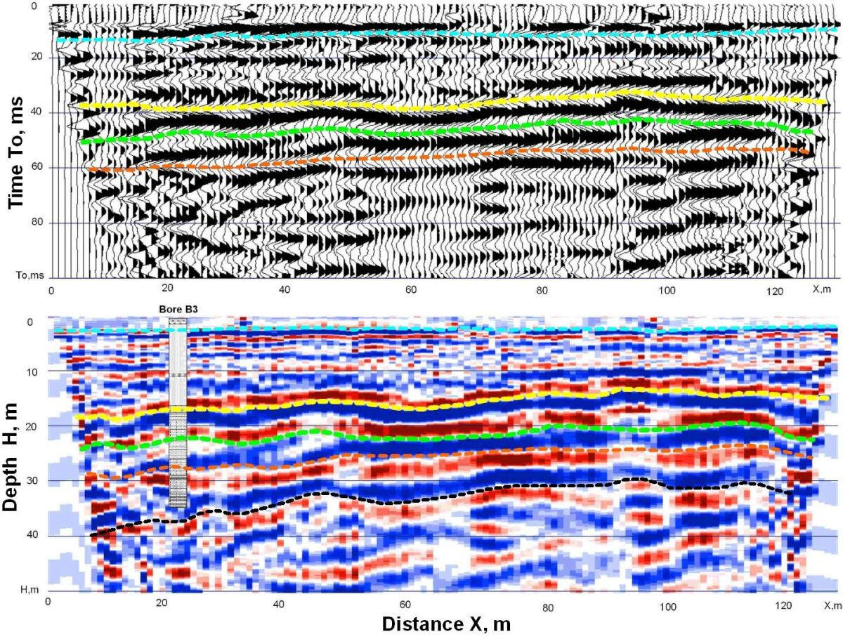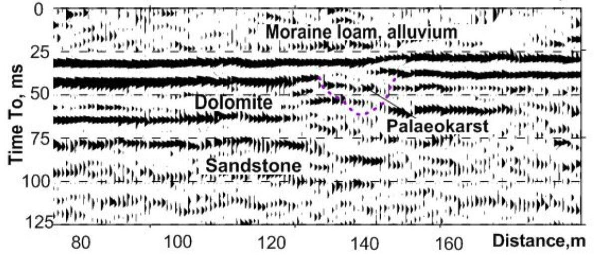 Usually aim for engineering surveys is to study the properties of the soil massif and the bedrock at a depth of 40-50 m. But sometimes there are specific tasks that require depth of study of 150-200 m. An example of such problems in the North-West of the Russian platform is the mapping and study of the structure of the buried pre-glacial valleys filled with moraine deposits. Similar problems arise in the study of erosion cuts in Paleozoic halogen-carbonate strata filled with low-velocity Mesozoic or Quaternary deposits. In some cases it is possible to obtain section with depth up to 200 m when sledge hammer weighing 6-8 kg is used as a source of elastic waves. Below an example of a time section across the palaeovalley edge buried in the area downstream of Plavinas hydroelectric power station is shown on the site survey for the projected renovation of drainage wells.