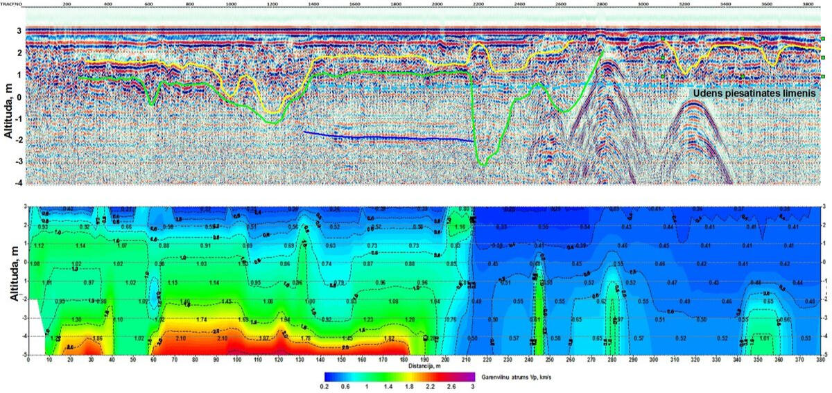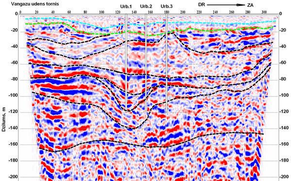 Mini-CDP section, inverted into depth scale, along the profile via buried pre-glacial palaeovalley. Area of water intake wells location near Vangazi settlement, Latvia
