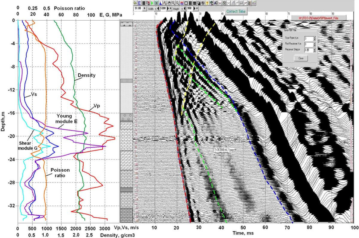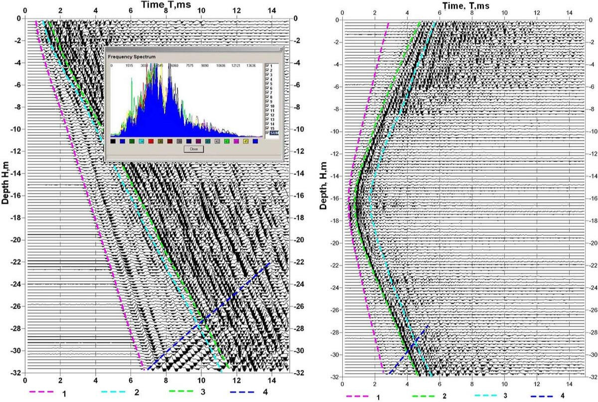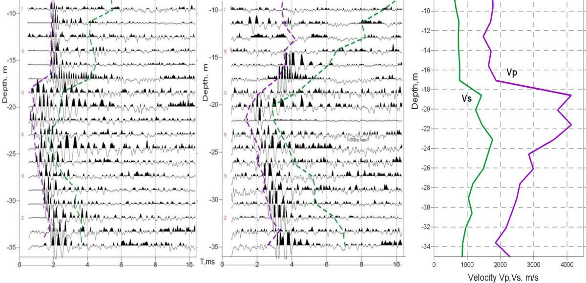 Measurements are carried out in three wells drilled at a distance of 3 m from each other along the same line. Wells are cased with polyethylene pipes with a check valve at the bottom of the casing and filled with water. The space between the case and borehole walls is tamponed by clay, or cement, or filled with water. During the measurement, the pulse emitter and receiver are lowered into adjacent wells to the same depth, provided by the technical specifications, a series of pulse excitations and recording of the stacking signal are performed, and then the emitter and receiver are moved to new positions. The first time the emitter and receiver are lowered to the depth of the water level in the wells, then moved down the trunk at intervals of 1.0-1.5 m, as provided by the specification. In accordance with the standard ASTM D 4428/D 4428M-07 in single channel mode, there are two or three series of measurements of longitudinal and transverse waves travel times: with the location of the emitter in the well 1, and receivers in the borehole 2 at a distance of 3 m and in well 3 at a distance of 6 m from the borehole 1. of the Acoustic pulse start synchronizes with the beginning of the recording by the starting piezoelectric transducer, placed in one container with emitter and connected to the data logger via a communication line.The figure shows the records obtained from the piezoceramic emitter with a pulse frequency of 4 kHz with an accumulation of 20 actions in each series of measurements. Measurements were made on the basis of 3 m (left) and 6 m (right). The first breaks of a direct longitudinal wave on the most part of the investigated depth interval are traced on the records. In the thickness of dolomites at a depth of more than 18 m signal-to-noise ratio reaches values of 20-30. In the upper part of the section, the conditions for signal passing deteriorate dramatically. Also the arrivals of the shear wave are not enough confident in many of the intervals.