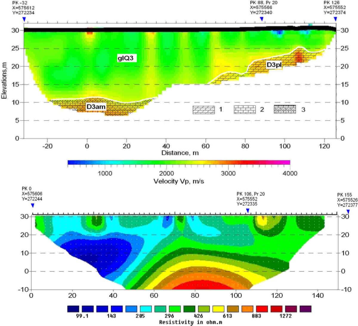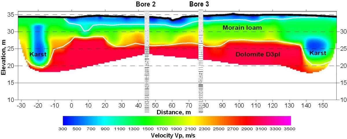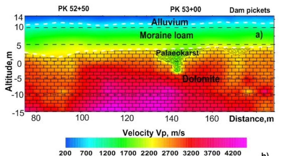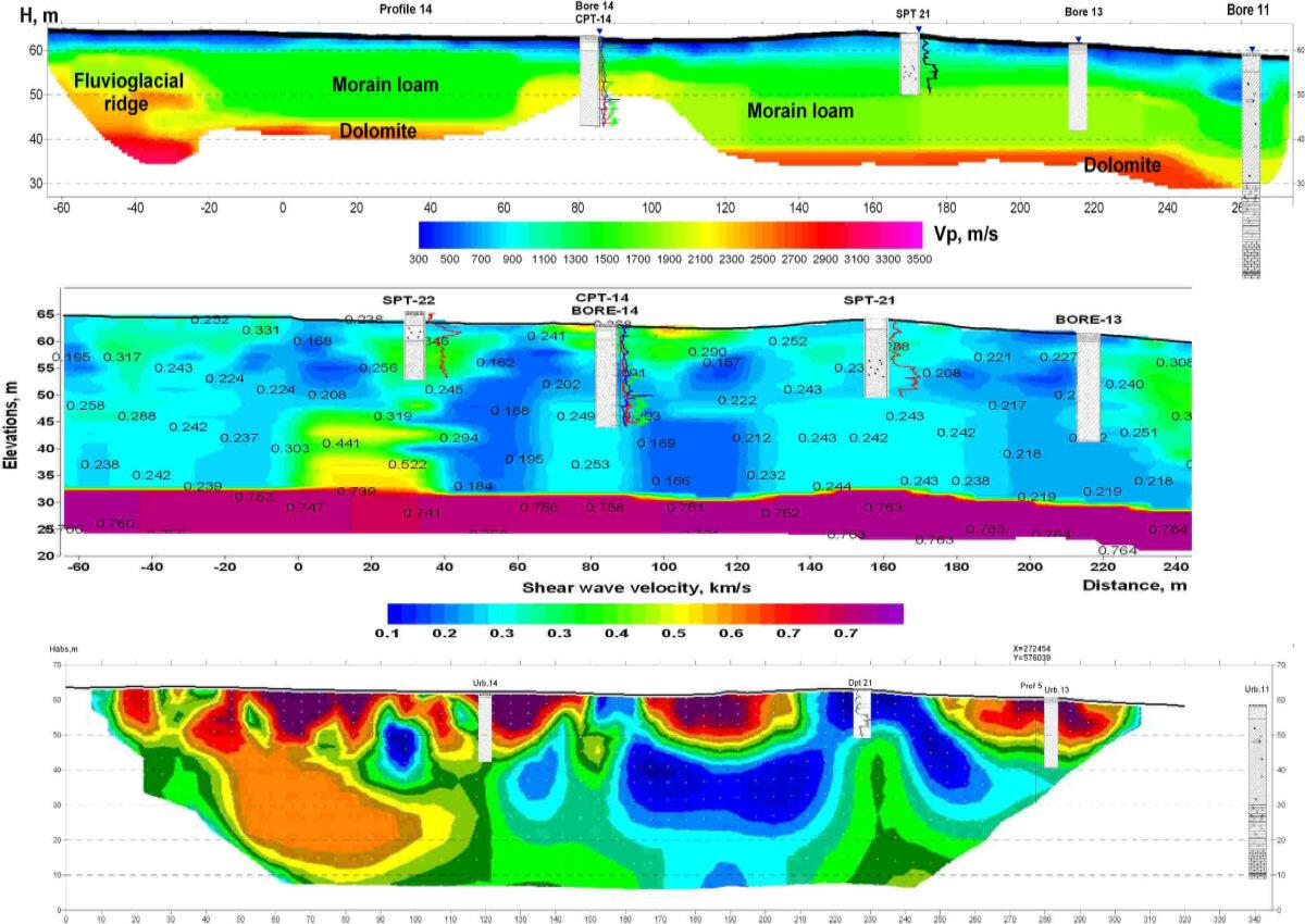 At the top – a section with a high-resistance layer of dry bulk sand near the HPP substation covering a thickness of water-saturated moraine loams in the middle part of the projected spillway. Below - a section with a layer of moist alluvial sand and moraine loam, lying on the bedrock dolomites on the site of the projected water dropping sump of reserved spillway in the lower pool of the dam. The manifestations of active and buried karst are outlined in this area, which can be seen in the section of apparent resistances in the form of its lower values, as well as in the sections of P-wave Vp and S-wave velocities according to the seismic survey performed here. During the drilling of geotechnical boreholes the presence of weathered dolomite and dolomite near the border of the moraine and the bedrock surface were revealed.
