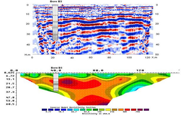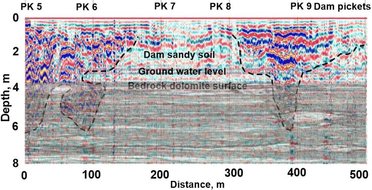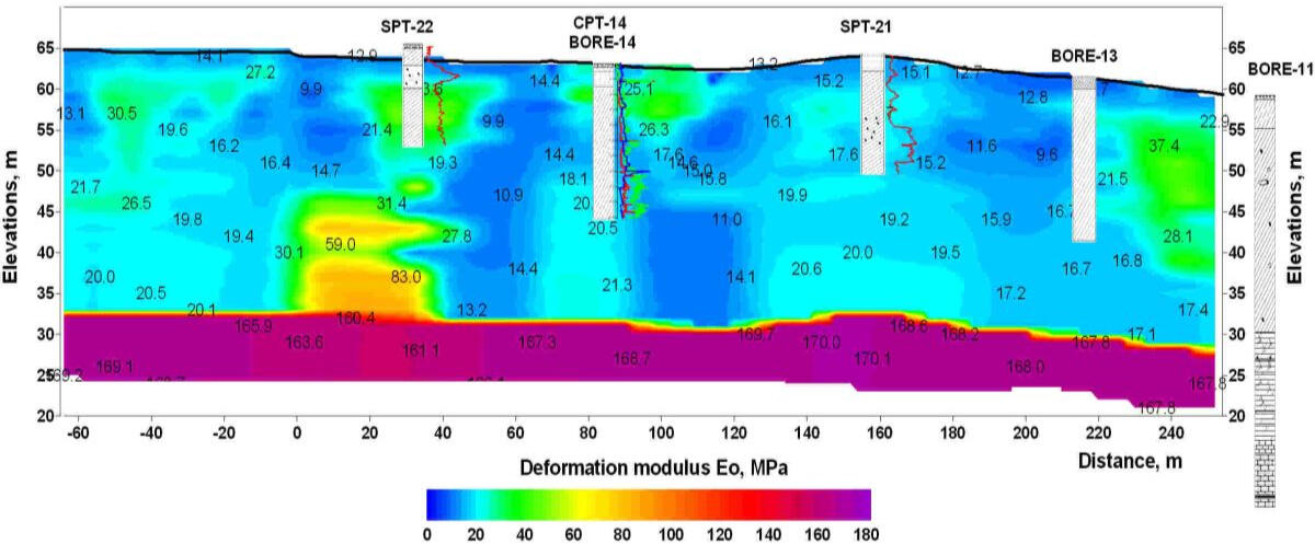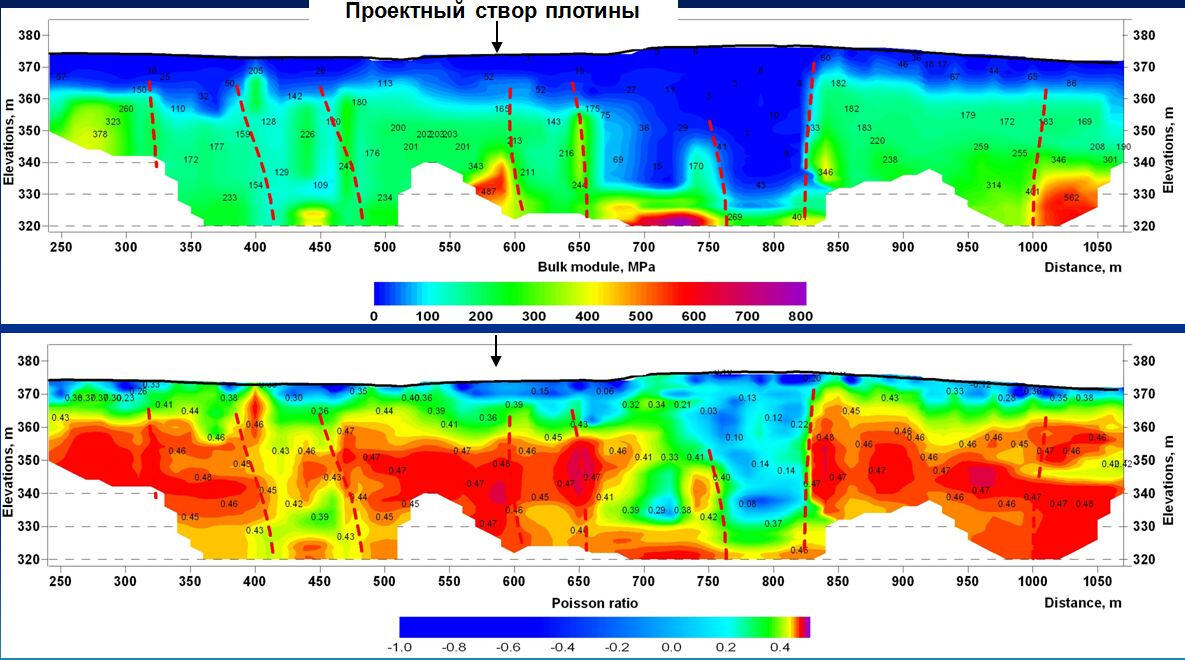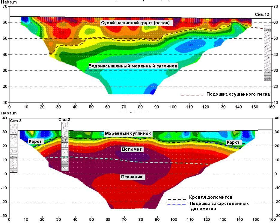 At the top – a section with a high-resistance layer of dry bulk sand near the HPP substation covering a thickness of water-saturated moraine loams in the middle part of the projected spillway. Below - a section with a layer of moist alluvial sand and moraine loam, lying on the bedrock dolomites on the site of the projected water dropping sump of reserved spillway in the lower pool of the dam. The manifestations of active and buried karst are outlined in this area, which can be seen in the section of apparent resistances in the form of its lower values, as well as in the sections of P-wave Vp and S-wave velocities according to the seismic survey performed here. During the drilling of geotechnical boreholes the presence of weathered dolomite and dolomite near the border of the moraine and the bedrock surface were revealed.