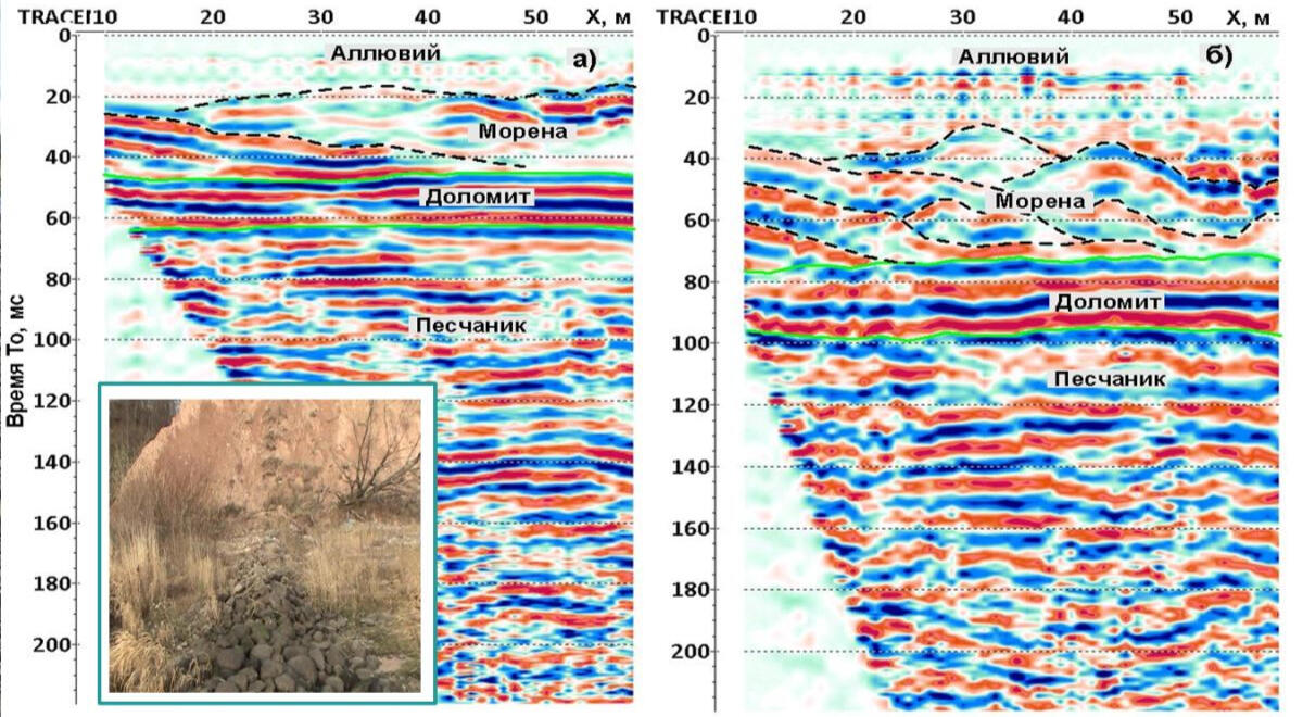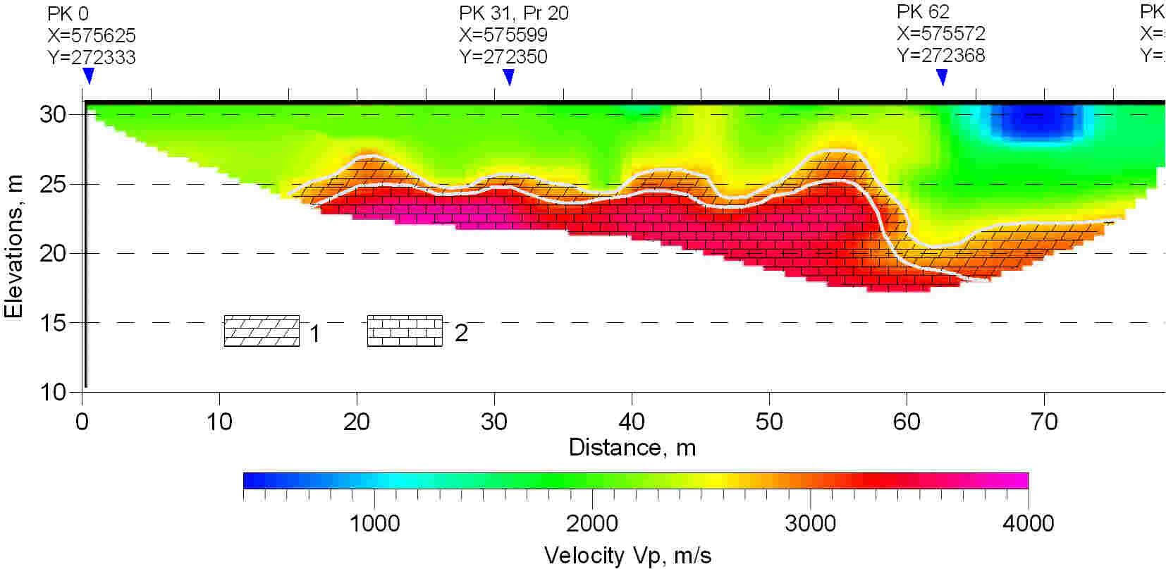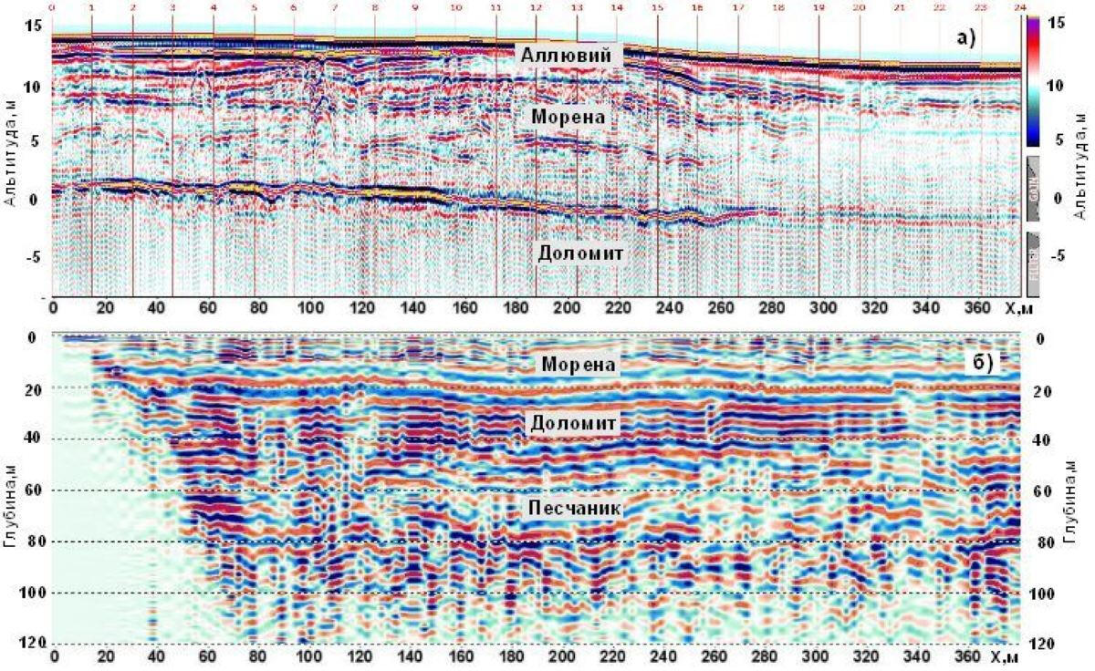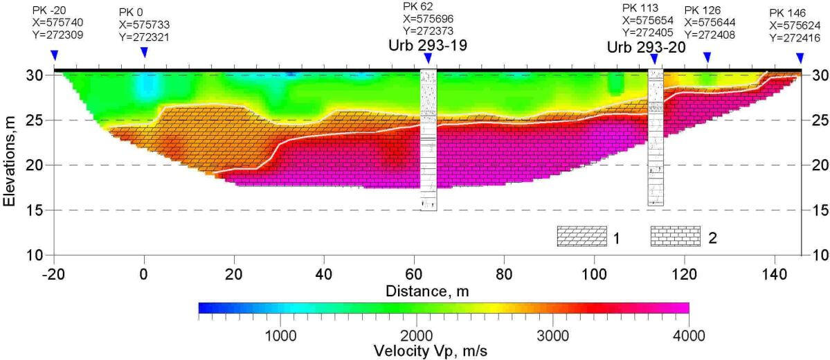 This profile clearly traces the roof of bedrock dolomites at a depth of 20-23 m under a thick layer of moraine loams. In the side parts of the valley reflecting boundary can be traced, associated, presumably, with the coarse deluvial sediments in the cut off parts of the strips. In this example, differences in depth of investigation of different methods clearly manifest. Thus, a boundary at a depth of about 150 m, presumably associated with the bed of loose Amata-Gauja sandstones, is traced on the CDP section, while the depth on the velocity section obtained by method of refracted waves is about 30 m with the length of the receiving geophone arrangement base of 126 m.These two sections are obtained using a sledge hammer weighing 6 kg with the accumulation of three blows. Receivers step 2 m, points of excitation in the first case-4 m, in the second-2 m. the length of the flank arrangement 126 m.