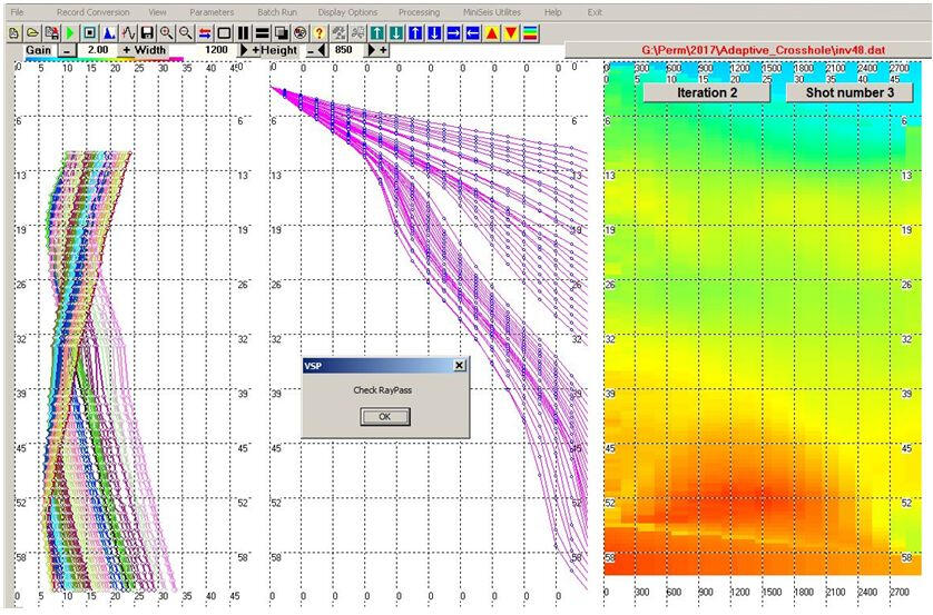 The algorithm for calculating radial velocities is based on the principle of minimum travel time along the beam between the source and the receiver. The selection of radial velocities is carried out using an iterative algorithm until a given minimum difference in the observed travel time is reached and calculated using a theoretical hodograph for a thin-layered model with an arbitrary lateral distribution of velocities in the layers. The program can be used for reciprocal observation schemes - direct and reverse VSP.