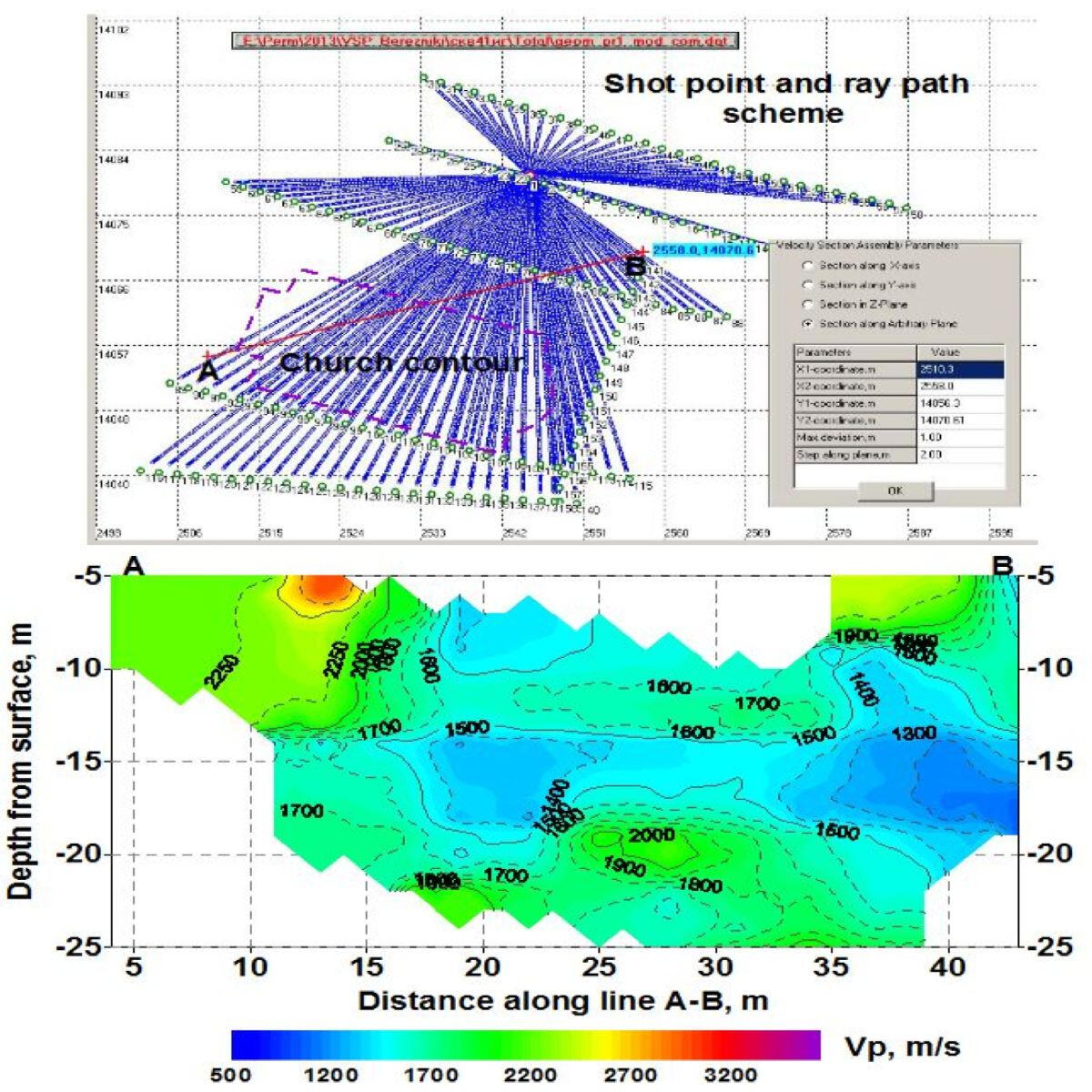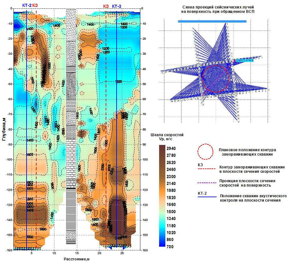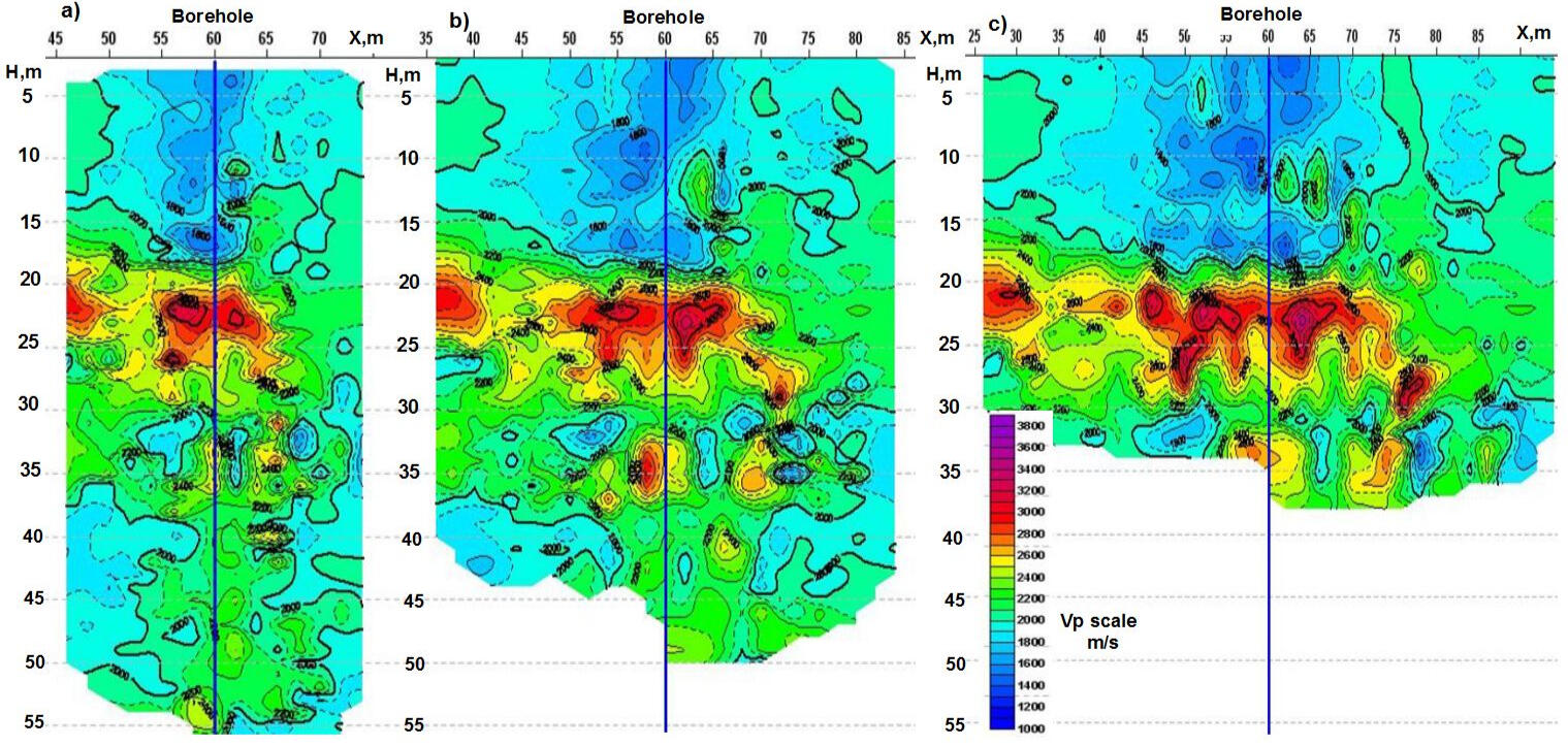 A system of non-longitudinal VSP, carried out along a linear profile using several differently spaced excitation points, or an equivalent inverted VSP system, can be transformed into an area system of non-longitudinal VSP with profiles located along several spatially separated lines of excitation points. Profiles of excitation or reception points are located along lines oriented in random order relative to the well. Excitation or reception profiles can be plotted along broken lines. The step of sources or geophones along the profiles is 2-16 m. The maximum distance of sources from the wellhead is determined by the energy of the emitter and the properties of the upper loose part of the soil mass and can reach 150-250 m.Processing of records and calculation of the velocity sections shown below were carried out using inverted VSP materials obtained by the Department of Active Seismoacoustics of the Mining Institute of the Ural Branch of the Russian Academy of Sciences (Perm)