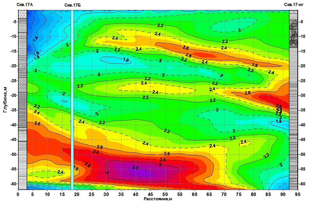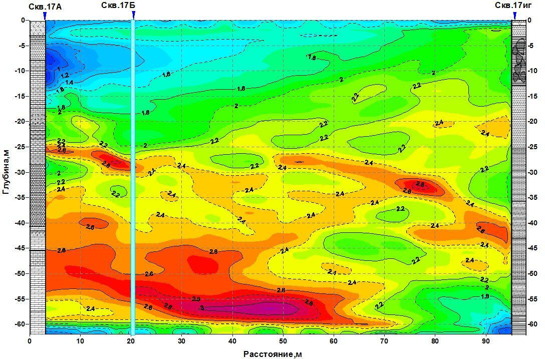 Summary tomographic section of velocities obtained by radiation in borehole 17A and reception of signals in borehole 17B at a distance of 20 m and in borehole 17ig at a distance of 96 m.