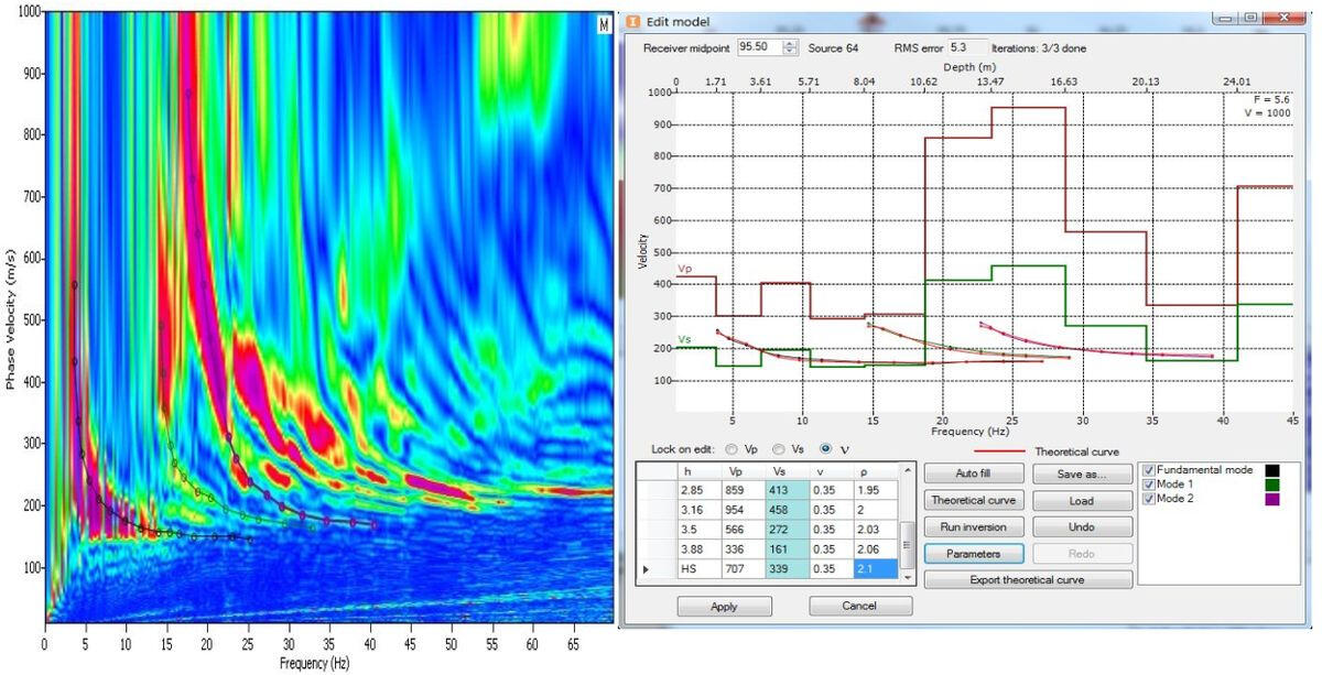 The main precondition for multichannel frequency analysis is the predominance of the energy components of transverse displacements during propagation of oscillations along the surface of the media and frequency dispersion of phase velocities – an increase of visible period and, accordingly, an increase of the penetration depth of surface wave energy into the thickness of the soil massif. The matrix of phase velocities of several Rayleigh surface wave modes characterizing strong frequency dispersion of phase velocities is shown below. The dispersion curves of the zero, first and second harmonics of the surface wave are used for calculation of the transverse wave velocities model.The above results of multichannel analysis of surface waves are obtained using RadExPro software complex (Deco-Geophysics, Moscow).