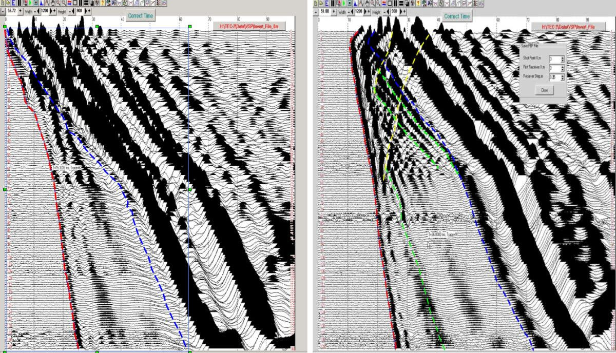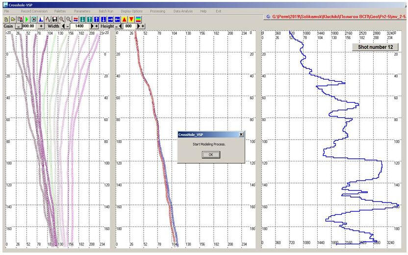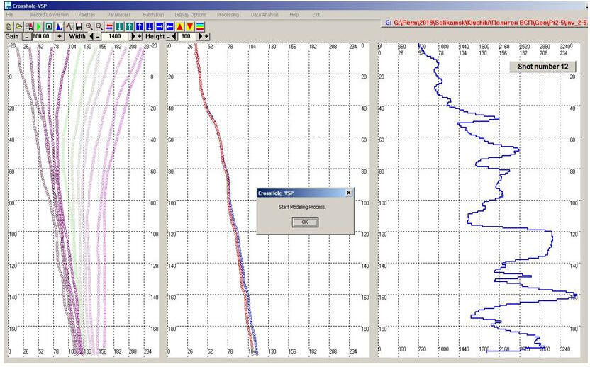 Traditionally, the distance between the hydrophone channels in the probe is 1 m. If it is needed more detailed data, for example with a step size of 0.25 m 4 series of excitations are performed with the movement of the probe each time for 25 cm up the well bore. After that, the probe moves up to its full length from the initial position of + 1m and the following 4 series of excitations and registrations are performed. The treatment program compiles a summary VSP seismogram with increments between receivers 25 cm. With this rate of the times at the vertical hodograph it is possible to obtain an elastic waves velocity section, approaching on detail level to the charts of cone penetration testing (CPT).