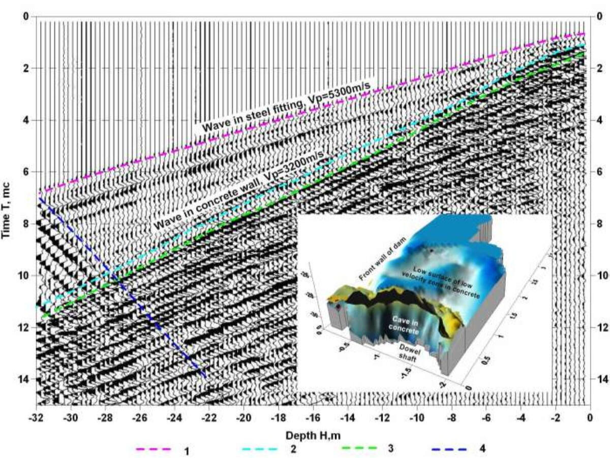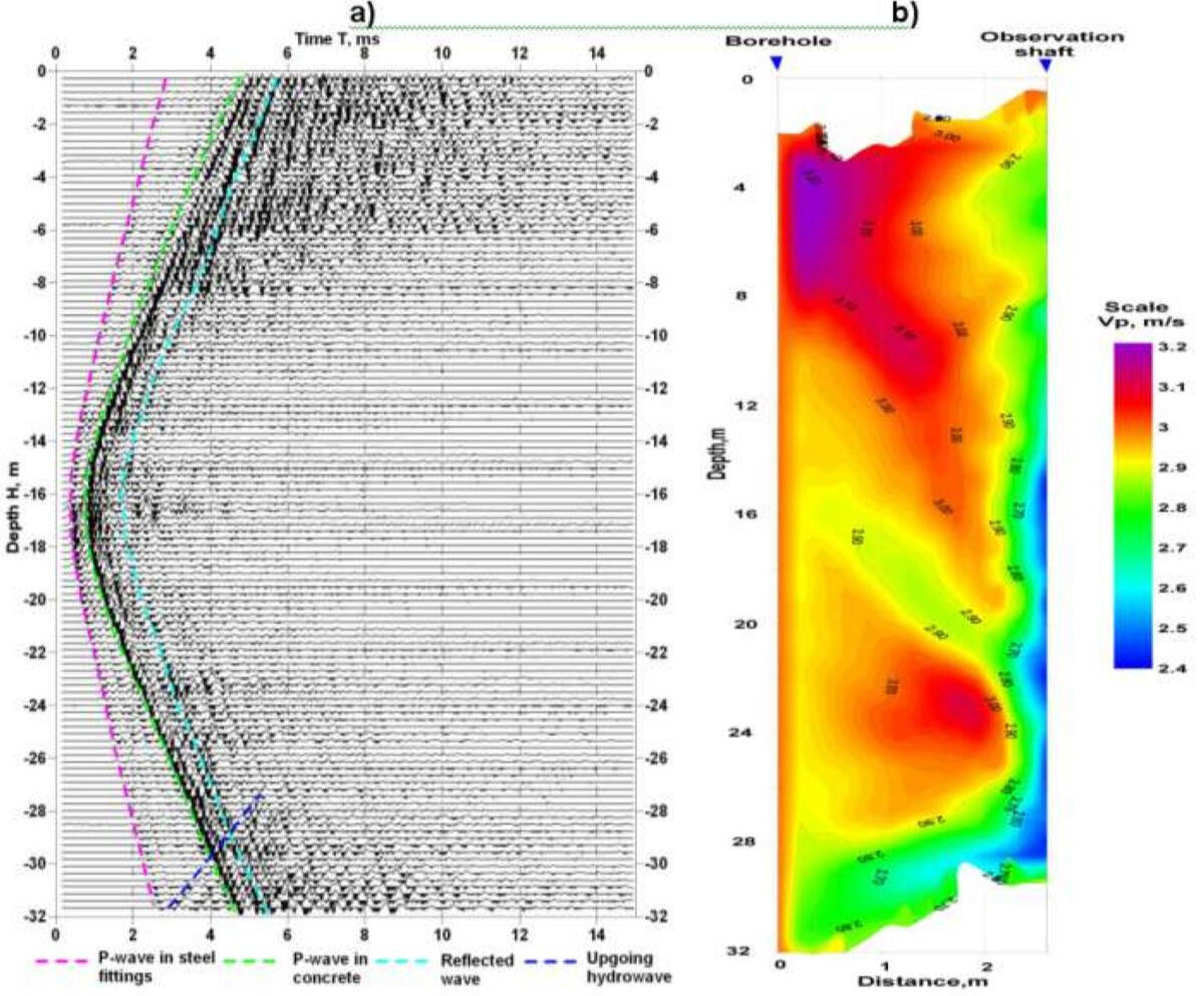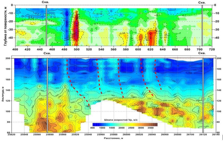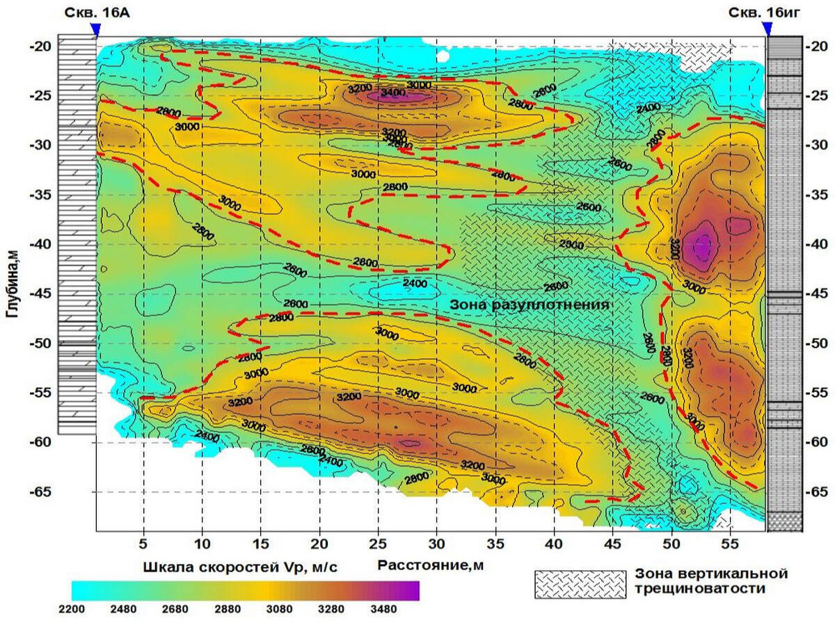 The figure shows an example of a vertical section of longitudinal wave velocities along a profile passing through two geotechnical wells, one of which is located in a zone of accelerated subsidence of the earth's surface above a water-logged mine opening in the salt column.