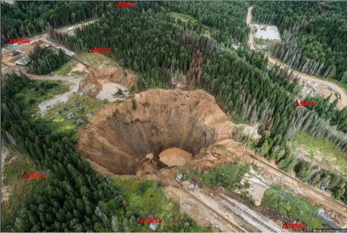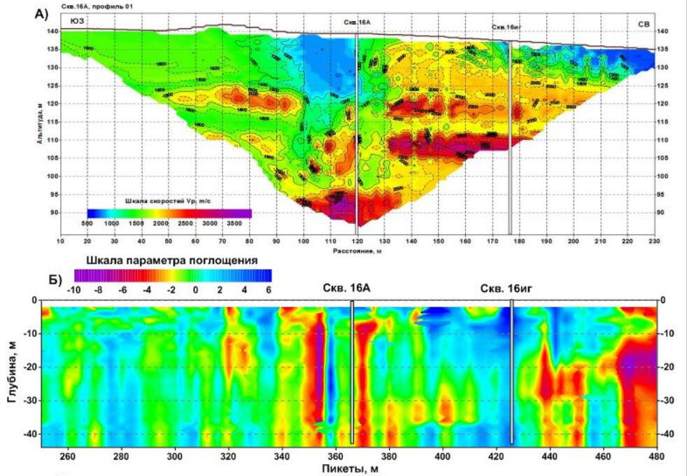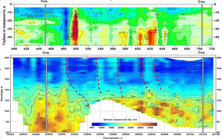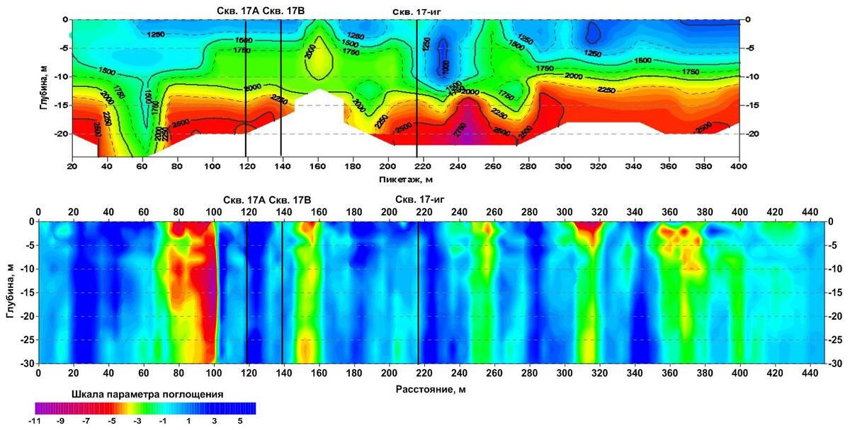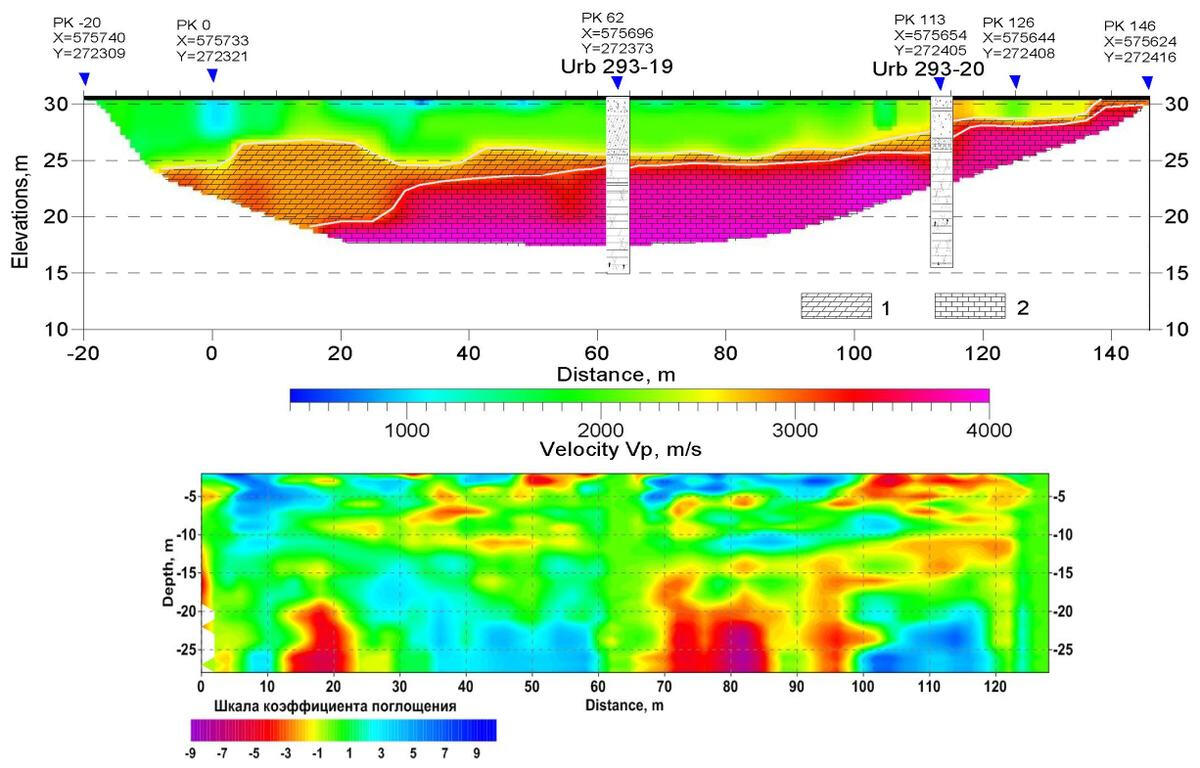 Following results of calculation of longitudinal wave velocity sections and energy of surface wave dissipation based on the materials submitted by the division of active seismoacoustic of Mining Institute of UB RAS (Perm).The positive values of the absorption coefficient (blue) correspond to the areas with low longitudinal wave velocities at the earth’s surface subsidence sites. The anomalous areas with negative values of the absorption coefficient (red colors) correspond to places where the "feeding" of surface wave energy takes place due to reflection and scattering at the potential boundaries of zones in the rock massif with vertical fracturing and crushing.
