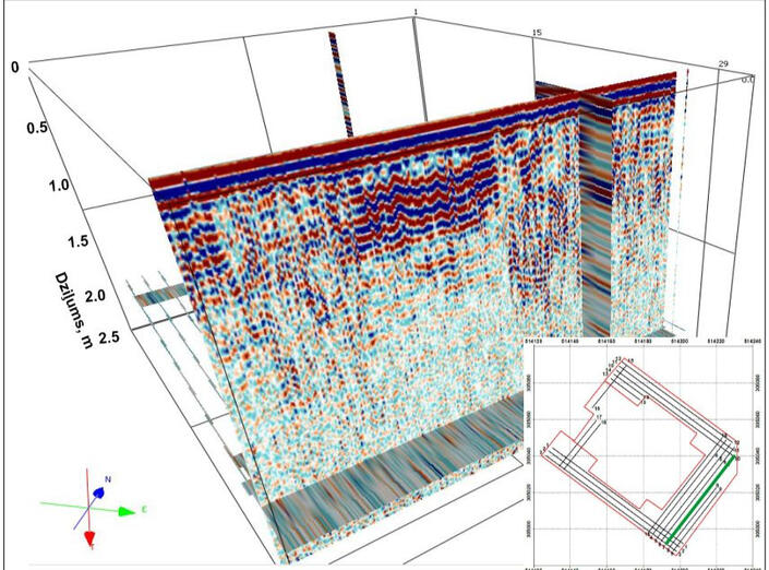 2023 г. SIA “Digitālās Ekonomikas Attistības Centrs” (г.Рига). Георадарное сканирование грунтового массива на участке строительства центра DEAC.