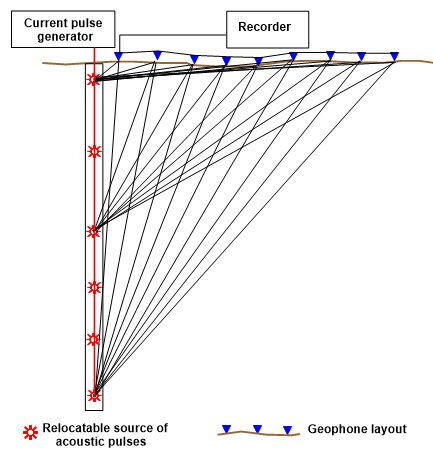 In the reverse version, vertical profiling is performed using a borehole pulse source and ground geophone receiving lines. At the same time, signals can be received in adjacent wells using multichannel piezoreceiving probes. An electric spark source consisting of a current pulse generator and a multielectrode emitter placed in a sealed container filled with salt water is used as a source of acoustic pulses. The accumulated electrical energy of radiation is about 1.0 -2.5 kJ. The step of moving the emitter along the wellbore from bottom to top is 1-5 m.
