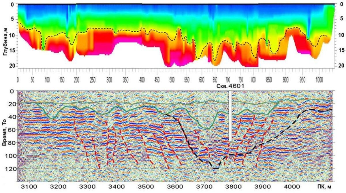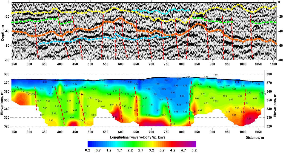 Of all the methods used in shallow-depth seismics, the method of reflected waves in the modification of the common depth point (CDP) is provided the greatest depth of the upper part of geological section investigation. The acquiring system provides a sufficiently high density of the points of elastic waves excitation and signal reception on a profile unit in order to provide multiple overlapping tracking of the reflecting boundaries.The technology of work is quite labor-intensive, but provides the most reliable information about the geometry of physical properties boundaries in the studied space, associated not only with stratification, but also with possible violations of rock continuity due to tectonic faults and fractures . In many cases, the use of simple and environmentally safe surface sources of elastic waves such as “drop weight” allows to obtain sufficiently strong reflections from the boundaries at a depth of up to 400-500 m.