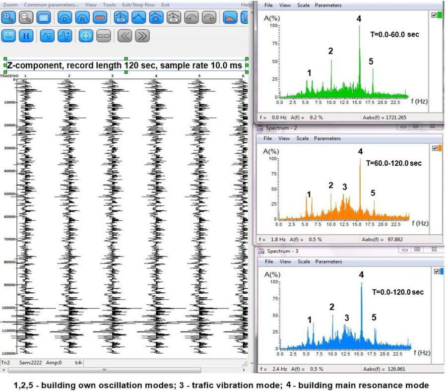An important factor in the vibration resistance of a structure is the ratio of its own resonant frequencies and the predominant vibration frequencies propagating in the base soil mass.Vibration measurements are performed with three-component displacement sensors or accelerometers in passive mode. Spectral analysis of records obtained over fairly long periods of time (minutes, tens of minutes) in various parts of a building or project construction site makes it possible to identify the maximum frequencies of various vibration modes and their sources (microseisms, transport noise, vibrations of operating mechanisms).