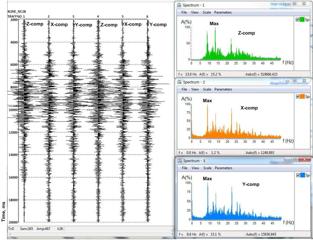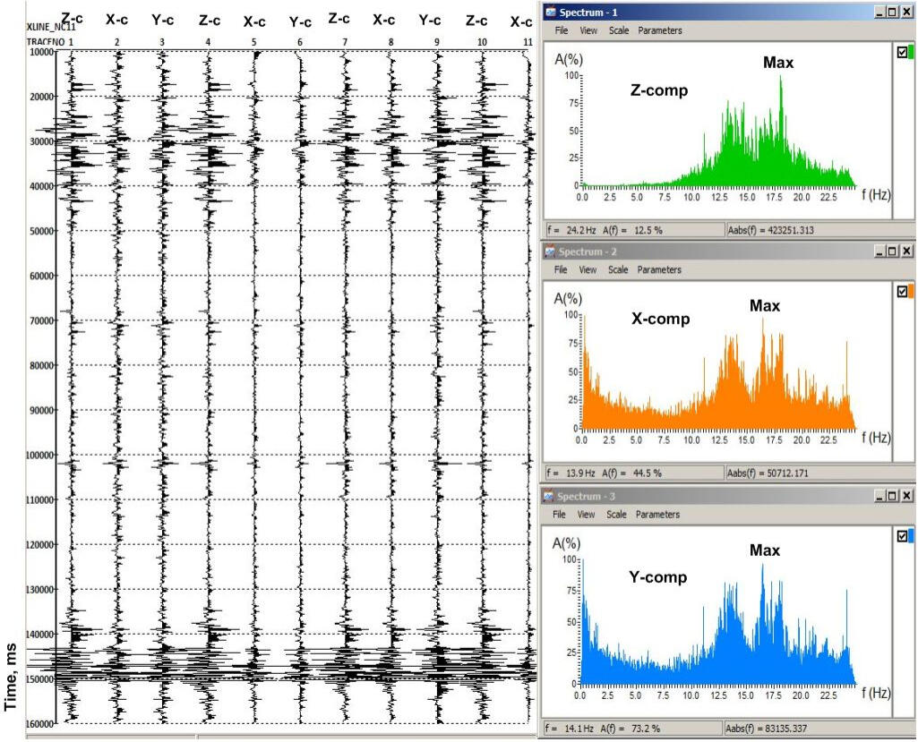 Analysis of the amplitudes and spectral composition of recorded signals with reversed VSP